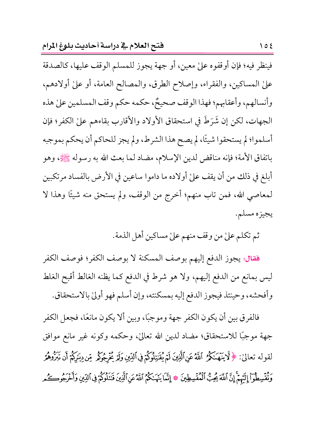 فالفرق بين أن يكون الكفر جهة وموجبًا، وبين ألا يكون مانعًا، فجعل الكفر جهة موجبًا للاستحقاق؛ مضاد لدين الله تعالى، وحكمه وكونه غير مانع موافق لقوله تعالى: {لَا يَنْهَاكُمُ اللَّهُ عَنِ الَّذِينَ لَمْ يُقَاتِلُوكُمْ فِي الدِّينِ وَلَمْ يُخْرِجُوكُمْ مِنْ دِيَارِكُمْ أَنْ تَبَرُّوهُمْ وَتُقْسِطُوا إِلَيْهِمْ إِنَّ اللَّهَ يُحِبُّ الْمُقْسِطِينَ * إِنَّمَا يَنْهَاكُمُ اللَّهُ عَنِ الَّذِينَ قَاتَلُوكُمْ فِي الدِّينِ وَأَخْرَجُوكُمْ