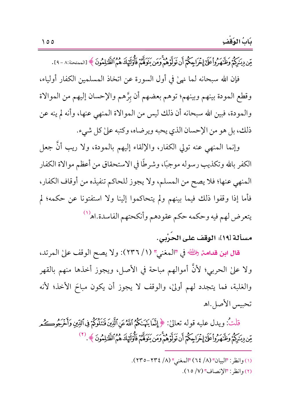 قلتُ: ويدل عليه قوله تعالى: {إِنَّمَا يَنْهَاكُمُ اللَّهُ عَنِ الَّذِينَ قَاتَلُوكُمْ فِي الدِّينِ وَأَخْرَجُوكُمْ مِنْ دِيَارِكُمْ وَظَاهَرُوا عَلَى إِخْرَاجِكُمْ أَنْ تَوَلَّوْهُمْ وَمَنْ يَتَوَلَّهُمْ فَأُولَئِكَ هُمُ الظَّالِمُونَ}. (¬٢)