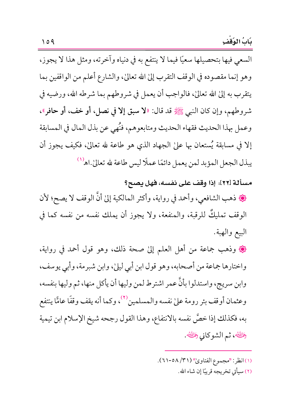 السعي فيها بتحصيلها سعيًا فيما لا ينتفع به في دنياه وآخرته، ومثل هذا لا يجوز، وهو إنما مقصوده في الوقف التقرب إلى الله تعالى، والشارع أعلم من الواقفين بما يتقرب به إلى الله تعالى، فالواجب أن يعمل في شروطهم بما شرطه الله، ورضيه في شروطهم، وإن كان النبي - صلى الله عليه وسلم - قد قال: «لا سبق إلا في نصل، أو خف، أو حافر»، وعمل بهذا الحديث فقهاء الحديث ومتابعوهم، فنُهي عن بذل المال في المسابقة إلا في مسابقة يُستعان بها على الجهاد الذي هو طاعة لله تعالى، فكيف يجوز أن يبذل الجعل المؤبد لمن يعمل دائمًا عملًا ليس طاعة لله تعالى. اهـ (¬١)
