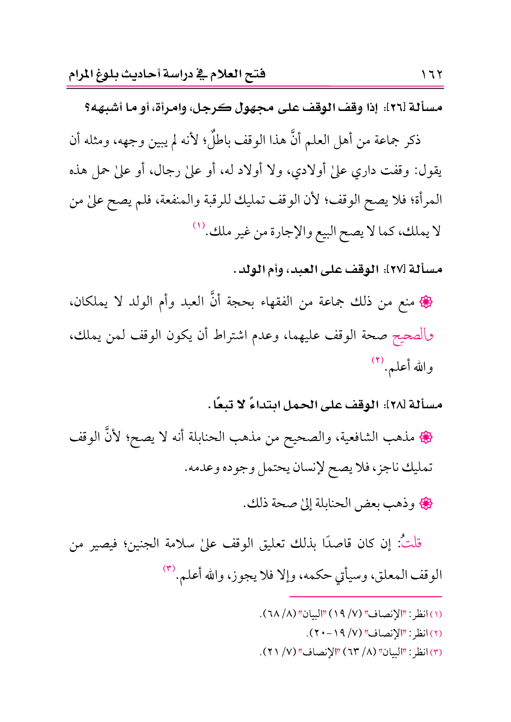• منع من ذلك جماعة من الفقهاء بحجة أنَّ العبد وأم الولد لا يملكان، والصحيح صحة الوقف عليهما، وعدم اشتراط أن يكون الوقف لمن يملك، والله أعلم. (¬٢)