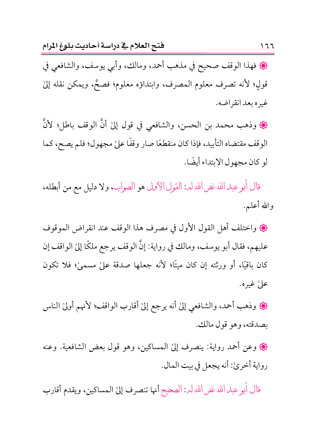 • فهذا الوقف صحيح في مذهب أحمد، ومالك، وأبي يوسف، والشافعي في قولٍ؛ لأنه تصرف معلوم المصرف، وابتداؤه معلوم؛ فصحَّ، ويمكن نقله إلى غيره بعد انقراضه.