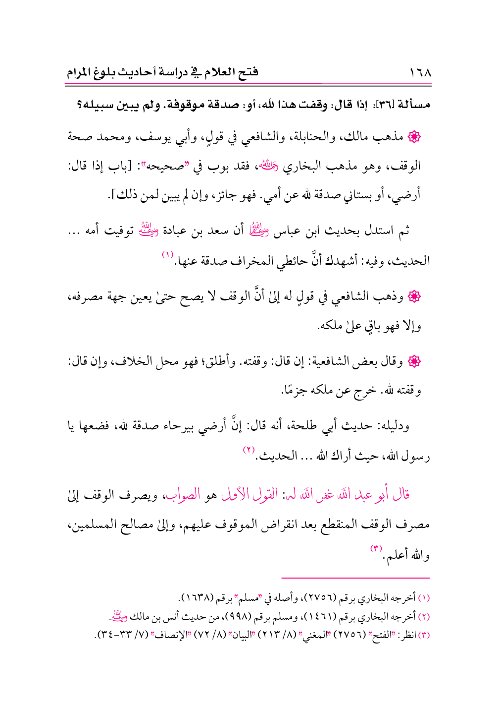 مسألة [٣٦]: إذا قال: وقفت هذا لله، أو: صدقة موقوفة. ولم يبين سبيله؟