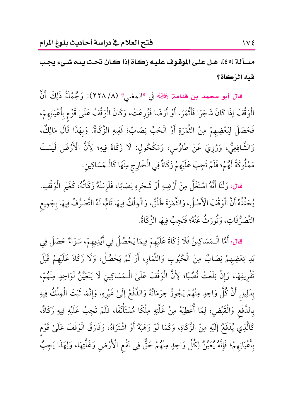 قال أبو محمد بن قدامة -رحمه الله- في «المغني» (٨/ ٢٢٨): وَجُمْلَةُ ذَلِكَ أَنَّ الْوَقْفَ إذَا كَانَ شَجَرًا فَأَثْمَرَ، أَوْ أَرْضًا فَزُرِعَتْ، وَكَانَ الْوَقْفُ عَلَى قَوْمٍ بِأَعْيَانِهِمْ، فَحَصَلَ لِبَعْضِهِمْ مِنْ الثَّمَرَةِ أَوْ الْحَبِّ نِصَابٌ؛ فَفِيهِ الزَّكَاةُ. وَبِهَذَا قَالَ مَالِكٌ، وَالشَّافِعِيُّ، وَرُوِيَ عَنْ طَاوُسٍ، وَمَكْحُولٍ: لَا زَكَاةَ فِيهِ؛ لِأَنَّ الْأَرْضَ لَيْسَتْ مَمْلُوكَةً لَهُمْ؛ فَلَمْ تَجِبْ عَلَيْهِمْ زَكَاةٌ فِي الْخَارِجِ مِنْهَا كَالْمَسَاكِينِ.