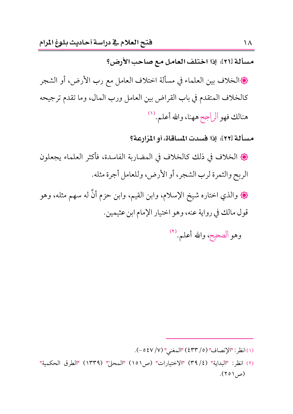 • الخلاف بين العلماء في مسألة اختلاف العامل مع رب الأرض، أو الشجر كالخلاف المتقدم في باب القراض بين العامل ورب المال، وما تقدم ترجيحه هنالك فهو الراجح ههنا، والله أعلم. (¬١)