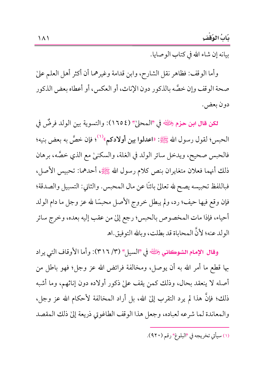 وقال الإمام الشوكاني -رحمه الله- في «السيل» (٣/ ٣١٦): وأما الأوقاف التي يراد بها قطع ما أمر الله به أن يوصل، ومخالفة فرائض الله عز وجل؛ فهو باطل من أصله لا ينعقد بحال، وذلك كمن يقف على ذكور أولاده دون إناثهم، وما أشبه ذلك؛ فإنَّ هذا لم يرد التقرب إلى الله، بل أراد المخالفة لأحكام الله عز وجل، والمعاندة لما شرعه لعباده، وجعل هذا الوقف الطاغوتي ذريعة إلى ذلك المقصد