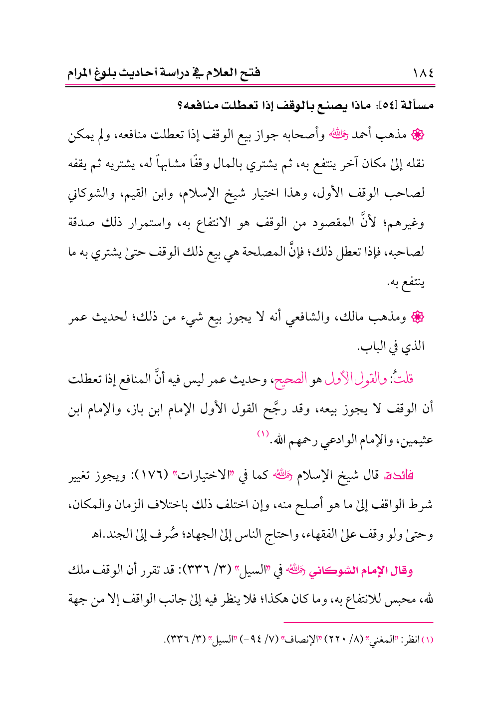 قلتُ: والقول الأول هو الصحيح، وحديث عمر ليس فيه أنَّ المنافع إذا تعطلت أن الوقف لا يجوز بيعه، وقد رجَّح القول الأول الإمام ابن باز، والإمام ابن عثيمين، والإمام الوادعي رحمهم الله. (¬١)