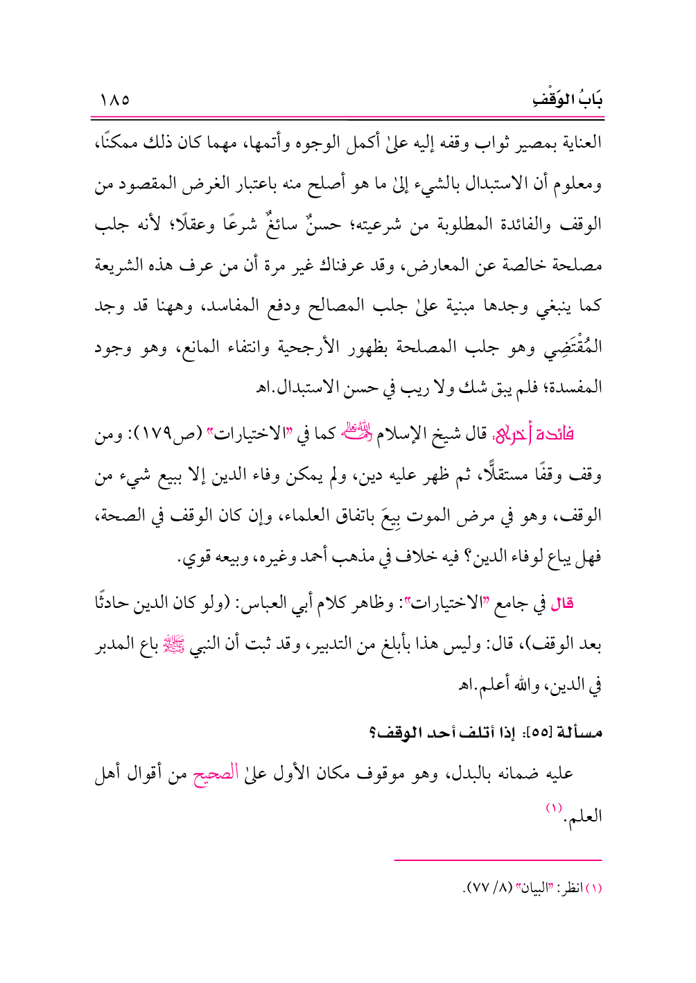 فائدة أخرى: قال شيخ الإسلام -رحمه الله تعالى- كما في «الاختيارات» (ص ١٧٩): ومن وقف وقفًا مستقلًّا، ثم ظهر عليه دين، ولم يمكن وفاء الدين إلا ببيع شيء من الوقف، وهو في مرض الموت بِيعَ باتفاق العلماء، وإن كان الوقف في الصحة، فهل يباع لوفاء الدين؟ فيه خلاف في مذهب أحمد وغيره، وبيعه قوي.