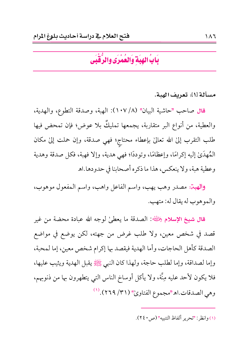 قال صاحب «حاشية البيان» (٨/ ١٠٧): الهبة، وصدقة التطوع، والهدية، والعطية، من أنواع البر متقاربة، يجمعها تمليكٌ بلا عوض؛ فإن تمحض فيها طلب التقرب إلى الله تعالى بإعطاء محتاجٍ؛ فهي صدقة، وإن حملت إلى مكان المُهدَى إليه إكرامًا، وإعظامًا، وتوددًا؛ فهي هدية، وإلا فهبة، فكل صدقة وهدية وعطية هبة، ولا ينعكس، هذا ما ذكره أصحابنا في حدودها. اهـ