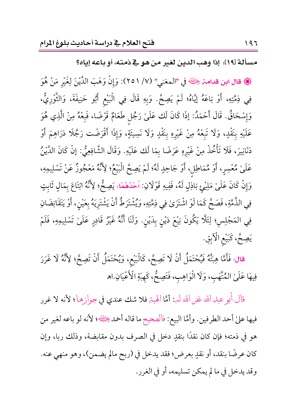 قال أبو عبد الله غفر الله له: أمَّا الهبة فلا شك عندي في جوازها؛ لأنه لا غرر فيها على أحد الطرفين. وأمَّا البيع: فالصحيح ما قاله أحمد -رحمه الله-؛ لأنه لو باعه لغير من هو في ذمته؛ فإن كان نقدًا بنقدٍ دخل في الصرف بدون مقابضة، وذلك ربا، وإن كان عرضًا بنقد، أو نقدٍ بعرض؛ فقد يدخل في (ربح مالم يضمن)، وهو منهي عنه. وقد يدخل في ما لم يمكن تسليمه، أو في الغرر.