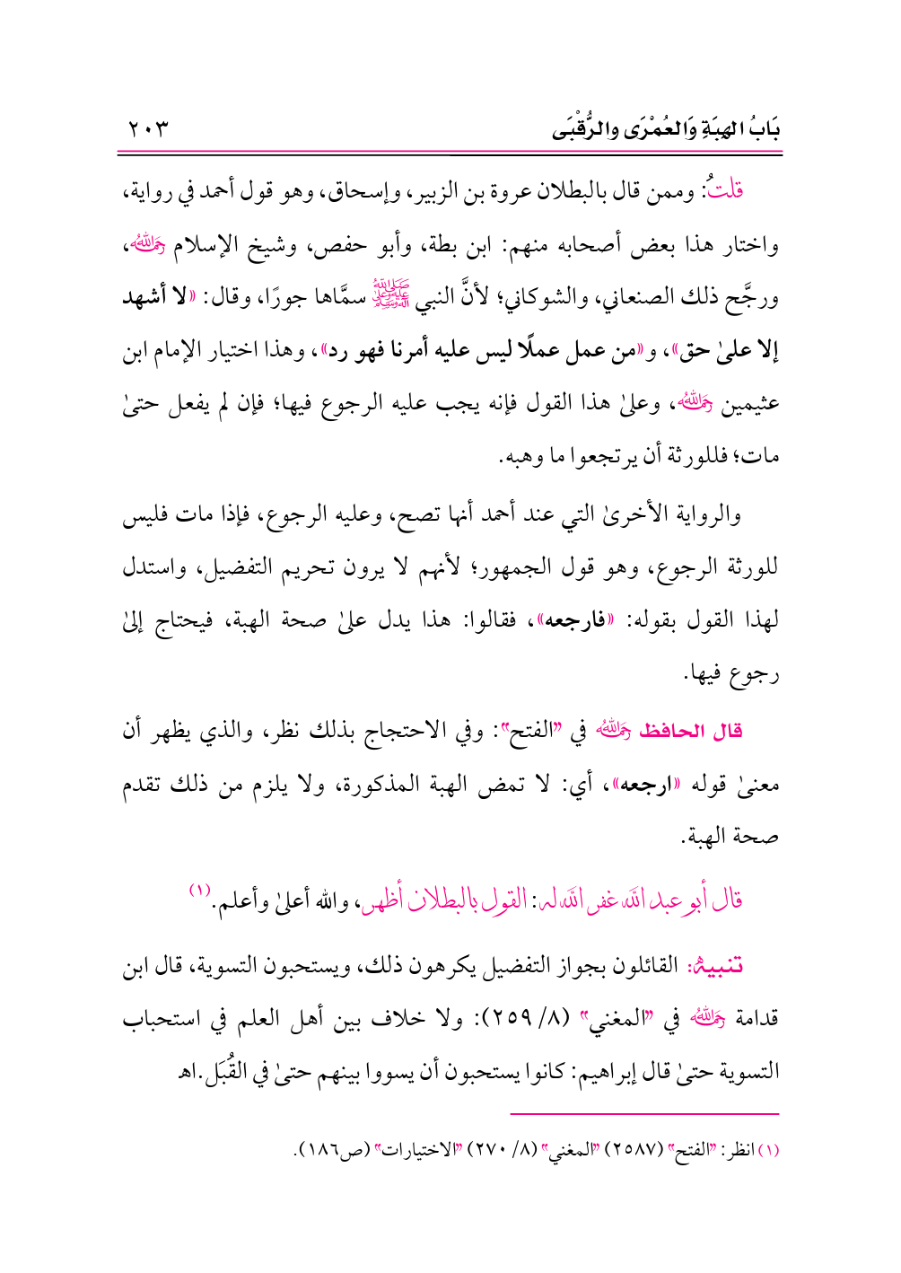 قلتُ: وممن قال بالبطلان عروة بن الزبير، وإسحاق، وهو قول أحمد في رواية، واختار هذا بعض أصحابه منهم: ابن بطة، وأبو حفص، وشيخ الإسلام -رحمه الله-، ورجَّح ذلك الصنعاني، والشوكاني؛ لأنَّ النبي -صلى الله عليه وعلى آله وسلم- سمَّاها جورًا، وقال: «لا أشهد إلا على حق»، و «من عمل عملًا ليس عليه أمرنا فهو رد»، وهذا اختيار الإمام ابن عثيمين -رحمه الله-، وعلى هذا القول فإنه يجب عليه الرجوع فيها؛ فإن لم يفعل حتى مات؛ فللورثة أن يرتجعوا ما وهبه.