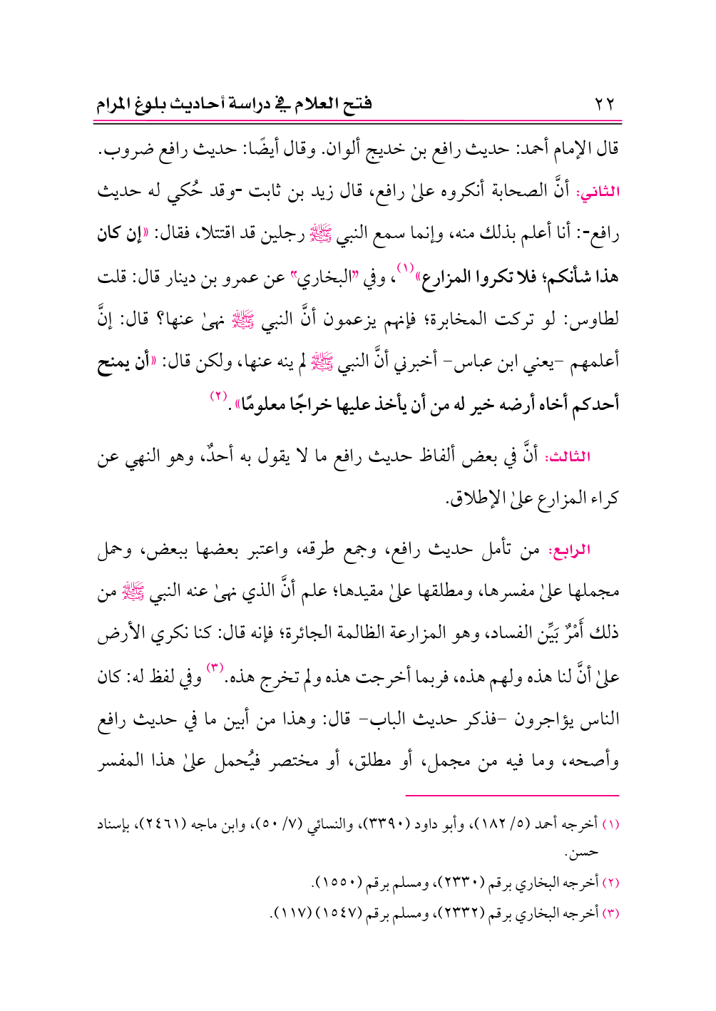 قال الإمام أحمد: حديث رافع بن خديج ألوان. وقال أيضًا: حديث رافع ضروب. الثاني: أنَّ الصحابة أنكروه على رافع، قال زيد بن ثابت وقد حُكي له حديث رافع: أنا أعلم بذلك منه، وإنما سمع النبي - صلى الله عليه وسلم - رجلين قد اقتتلا، فقال: «إن كان هذا شأنكم؛ فلا تكروا المزارع» (¬١)، وفي «البخاري» عن عمرو بن دينار قال: قلت لطاوس: لو تركت المخابرة؛ فإنهم يزعمون أنَّ النبي - صلى الله عليه وسلم - نهى عنها؟ قال: إنَّ أعلمهم -يعني ابن عباس- أخبرني أنَّ النبي - صلى الله عليه وسلم - لم ينه عنها، ولكن قال: «أن يمنح أحدكم أخاه أرضه خير له من أن يأخذ عليها خراجًا معلومًا». (¬٢)