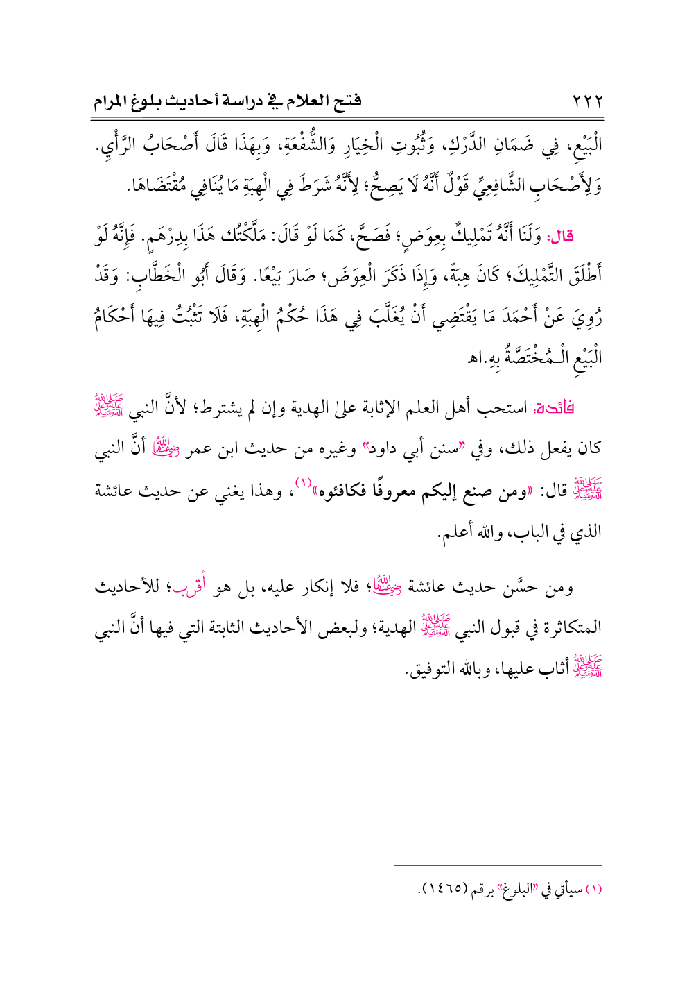 فائدة: استحب أهل العلم الإثابة على الهدية وإن لم يشترط؛ لأنَّ النبي -صلى الله عليه وعلى آله وسلم- كان يفعل ذلك، وفي «سنن أبي داود» وغيره من حديث ابن عمر -رضي الله عنهما- أنَّ النبي -صلى الله عليه وعلى آله وسلم- قال: «ومن صنع إليكم معروفًا فكافئوه» (¬١)، وهذا يغني عن حديث عائشة الذي في الباب، والله أعلم.