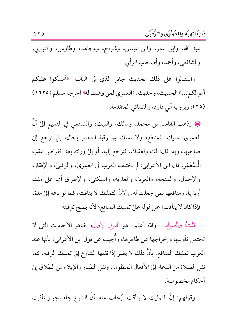 قلتُ: والصواب -والله أعلم- هو القول الأول؛ لظاهر الأحاديث التي لا تحتمل تأويلها وإخراجها عن ظاهرها، وأُجيب عن قول ابن الأعرابي: بأنها عند العرب تمليك المنافع. بأنَّ ذلك لا يضر إذا نقلها الشارع إلى تمليك الرقبة، كما نقل الصلاة من الدعاء إلى الأفعال المنظومة، ونقل الظهار والإيلاء من الطلاق إلى أحكام مخصوصة.