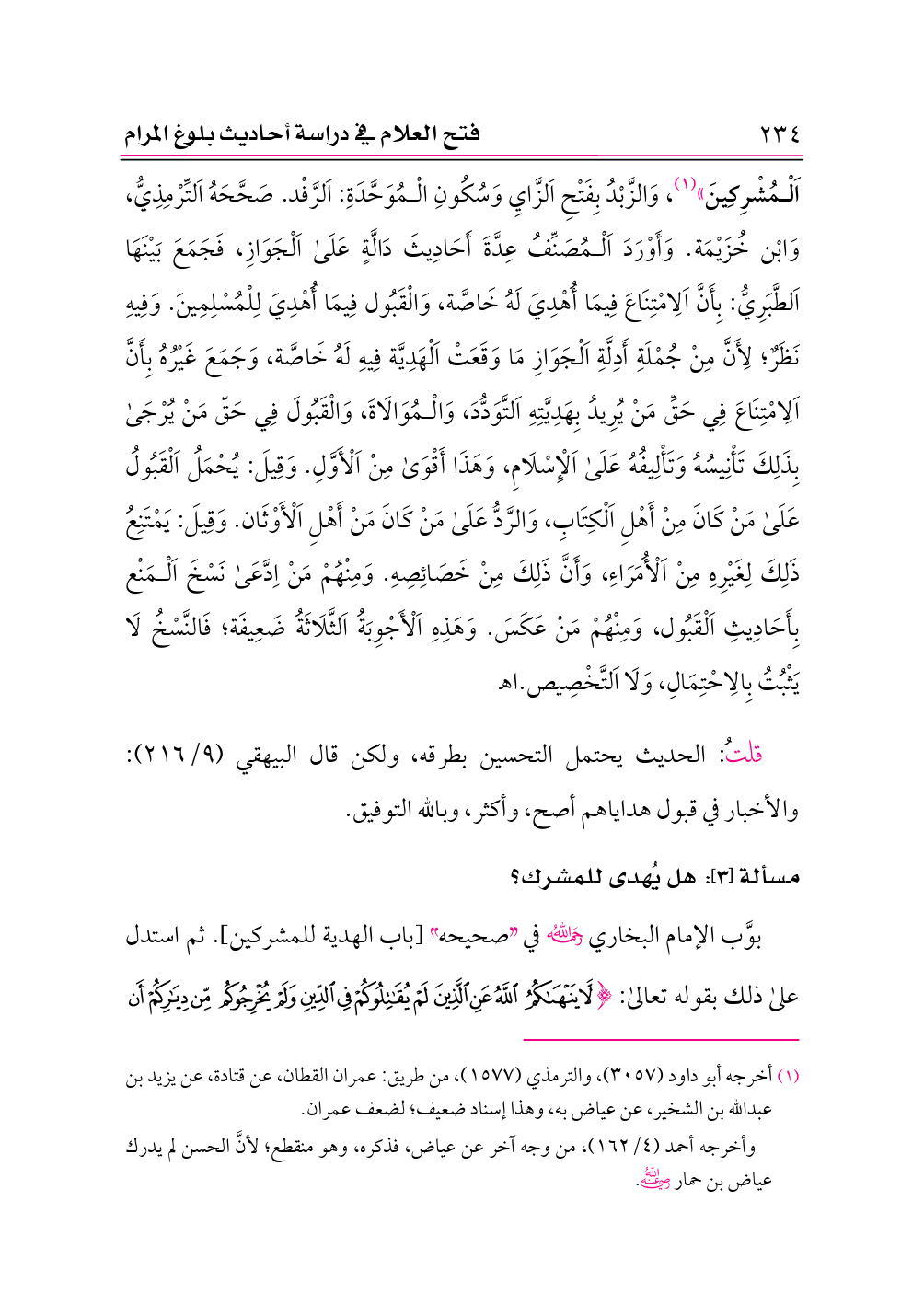 بوَّب الإمام البخاري -رحمه الله- في «صحيحه» [باب الهدية للمشركين]. ثم استدل على ذلك بقوله تعالى: {لَا يَنْهَاكُمُ اللَّهُ عَنِ الَّذِينَ لَمْ يُقَاتِلُوكُمْ فِي الدِّينِ وَلَمْ يُخْرِجُوكُمْ مِنْ دِيَارِكُمْ أَنْ