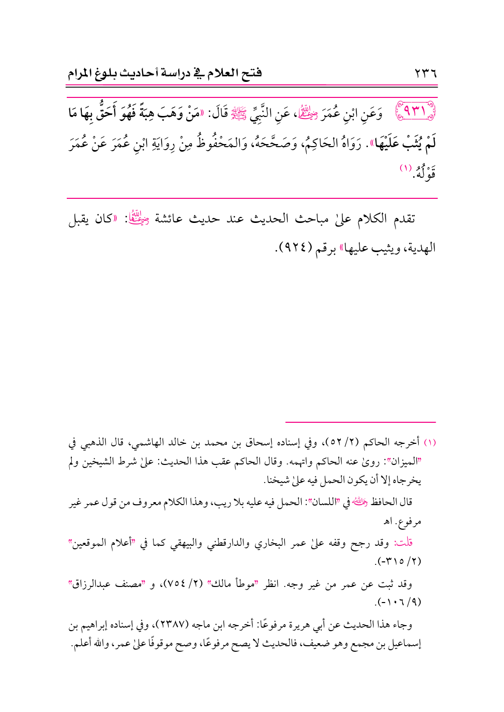 ٩٣١ - وَعَنِ ابْنِ عُمَرَ -رضي الله عنهما-، عَنِ النَّبِيِّ - صلى الله عليه وسلم - قَالَ: «مَنْ وَهَبَ هِبَةً فَهُوَ أَحَقُّ بِهَا مَا لَمْ يُثَبْ عَلَيْهَا». رَوَاهُ الحَاكِمُ، وَصَحَّحَهُ، وَالمَحْفُوظُ مِنْ رِوَايَةِ ابْنِ عُمَرَ عَنْ عُمَرَ قَوْلُهُ. (¬١)