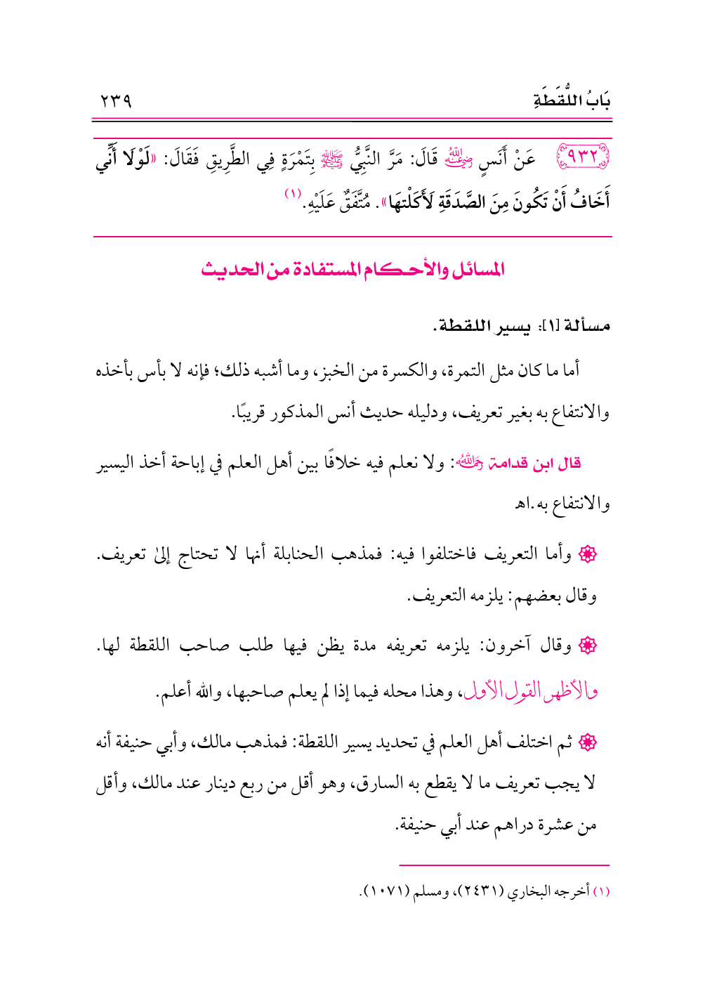 ٩٣٢ - عَنْ أَنَسٍ -رضي الله عنه- قَالَ: مَرَّ النَّبِيُّ - صلى الله عليه وسلم - بِتَمْرَةٍ فِي الطَّرِيقِ فَقَالَ: «لَوْلَا أَنِّي أَخَافُ أَنْ تَكُونَ مِنَ الصَّدَقَةِ لَأَكَلْتهَا». مُتَّفَقٌ عَلَيْهِ. (¬١)