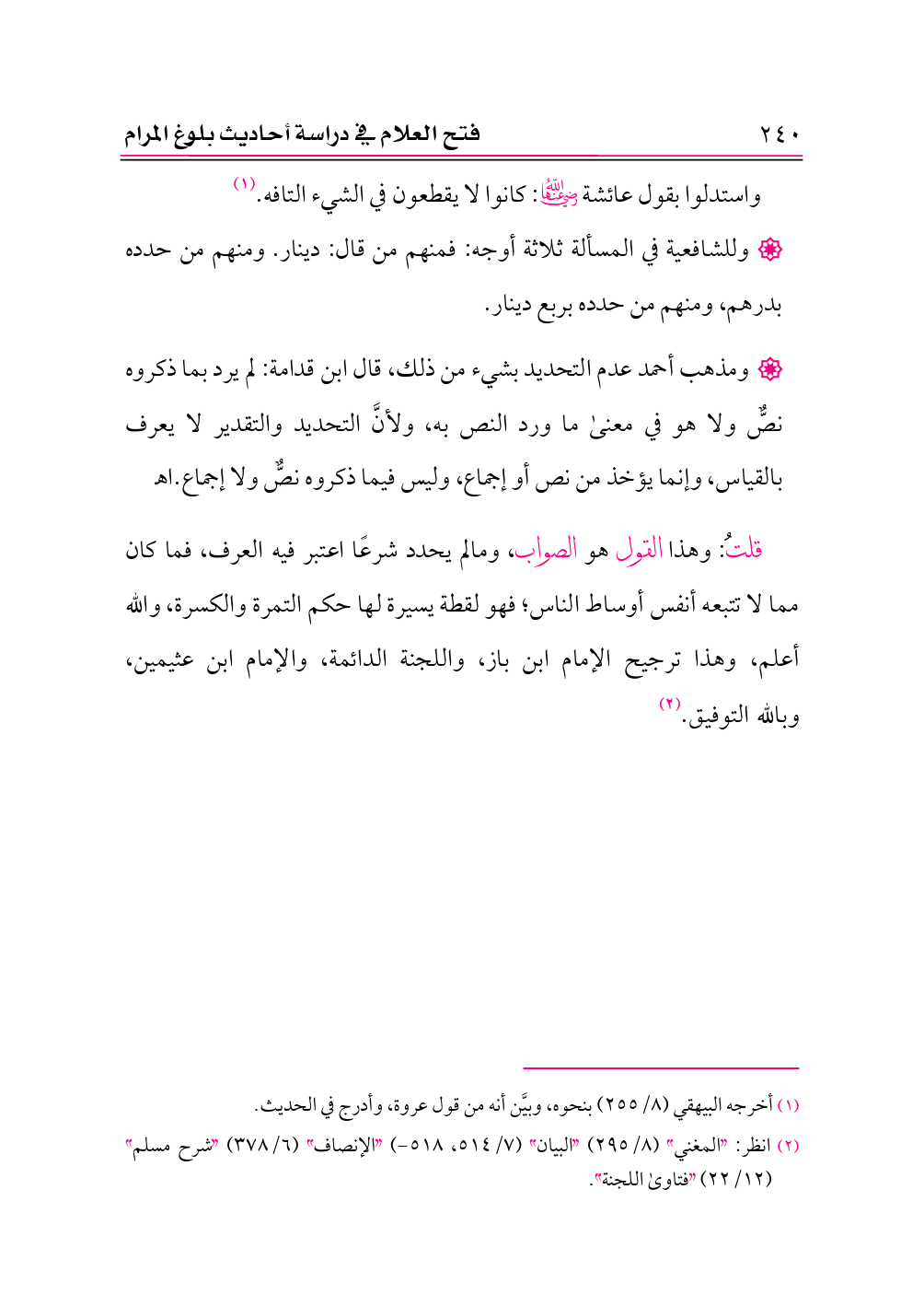 قلتُ: وهذا القول هو الصواب، ومالم يحدد شرعًا اعتبر فيه العرف، فما كان مما لا تتبعه أنفس أوساط الناس؛ فهو لقطة يسيرة لها حكم التمرة والكسرة، والله أعلم، وهذا ترجيح الإمام ابن باز، واللجنة الدائمة، والإمام ابن عثيمين، وبالله التوفيق. (¬٢)