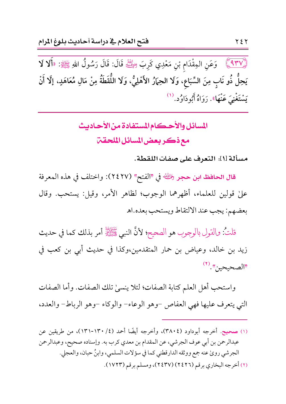٩٣٧ - وَعَنِ المِقْدَامِ بْنِ مَعْدِي كَرِبَ -رضي الله عنه- قَالَ: قَالَ رَسُولُ اللهِ - صلى الله عليه وسلم -: «أَلَا لَا يَحِلُّ ذُو نَابٍ مِنَ السِّبَاعِ، وَلَا الحِمَارُ الأَهْلِيُّ، وَلَا اللُّقَطَةُ مِنْ مَالِ مُعَاهَدٍ، إلَّا أَنْ يَسْتَغْنِيَ عَنْهَا». رَوَاهُ أَبُودَاوُد. (¬١)