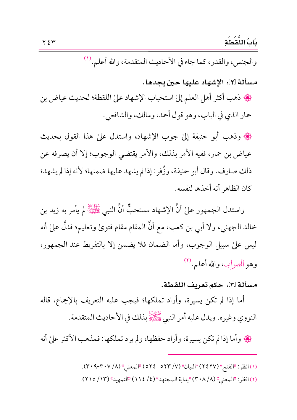 واستدل الجمهور على أنَّ الإشهاد مستحبٌّ أنَّ النبي -صلى الله عليه وعلى آله وسلم- لم يأمر به زيد بن خالد الجهني، ولا أبي بن كعب، مع أنَّ المقام مقام فتوى وتعليم؛ فدلَّ على أنه ليس على سبيل الوجوب، وأما الضمان فلا يضمن إلا بالتفريط عند الجمهور، وهو الصواب، والله أعلم. (¬٢)