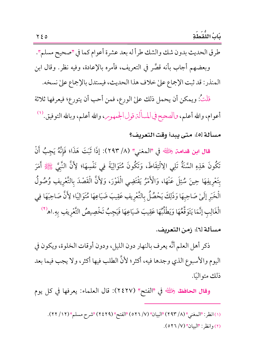 قال ابن قدامة -رحمه الله- في «المغني» (٨/ ٢٩٣): إذَا ثَبَتَ هَذَا؛ فَإِنَّهُ يَجِبُ أَنْ تَكُونَ هَذِهِ السَّنَةُ تَلِي الِالْتِقَاطَ، وَتَكُونَ مُتَوَالِيَةً فِي نَفْسِهَا؛ لِأَنَّ النَّبِيَّ - صلى الله عليه وسلم - أَمَرَ بِتَعْرِيفِهَا حِينَ سُئِلَ عَنْهَا، وَالْأَمْرُ يَقْتَضِي الْفَوْرَ، وَلِأَنَّ الْقَصْدَ بِالتَّعْرِيفِ وُصُولُ الْخَبَرِ إلَى صَاحِبِهَا وَذَلِكَ يَحْصُلُ بِالتَّعْرِيفِ عَقِيبَ ضَيَاعِهَا مُتَوَالِيًا؛ لِأَنَّ صَاحِبَهَا فِي الْغَالِبِ إنَّمَا يَتَوَقَّعُهَا وَيَطْلُبُهَا عَقِيبَ ضَيَاعِهَا فَيَجِبُ تَخْصِيصُ التَّعْرِيفِ بِهِ. اهـ (¬٢)