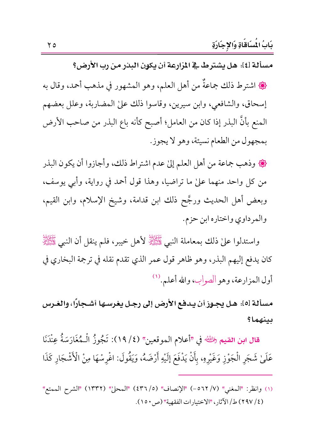 واستدلوا على ذلك بمعاملة النبي -صلى الله عليه وعلى آله وسلم- لأهل خيبر، فلم ينقل أن النبي -صلى الله عليه وعلى آله وسلم- كان يدفع إليهم البذر، وهو ظاهر قول عمر الذي تقدم نقله في ترجمة البخاري في أول المزارعة، وهو الصواب، والله أعلم. (¬١)
