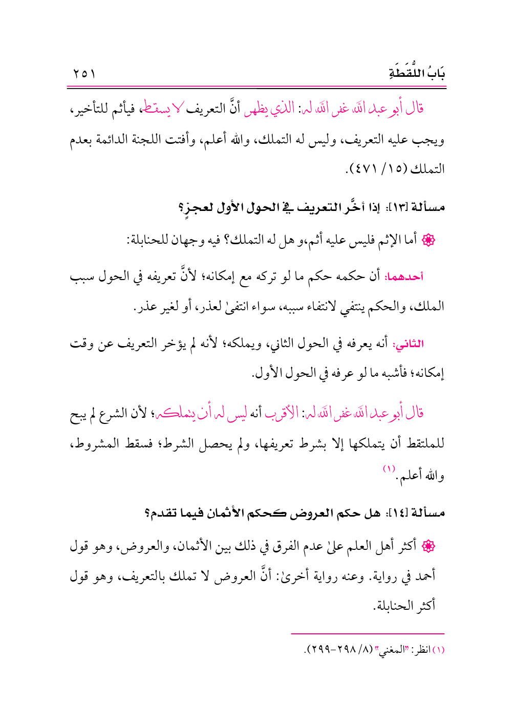 قال أبو عبد الله غفر الله له: الذي يظهر أنَّ التعريف لا يسقط، فيأثم للتأخير، ويجب عليه التعريف، وليس له التملك، والله أعلم، وأفتت اللجنة الدائمة بعدم التملك (١٥/ ٤٧١).