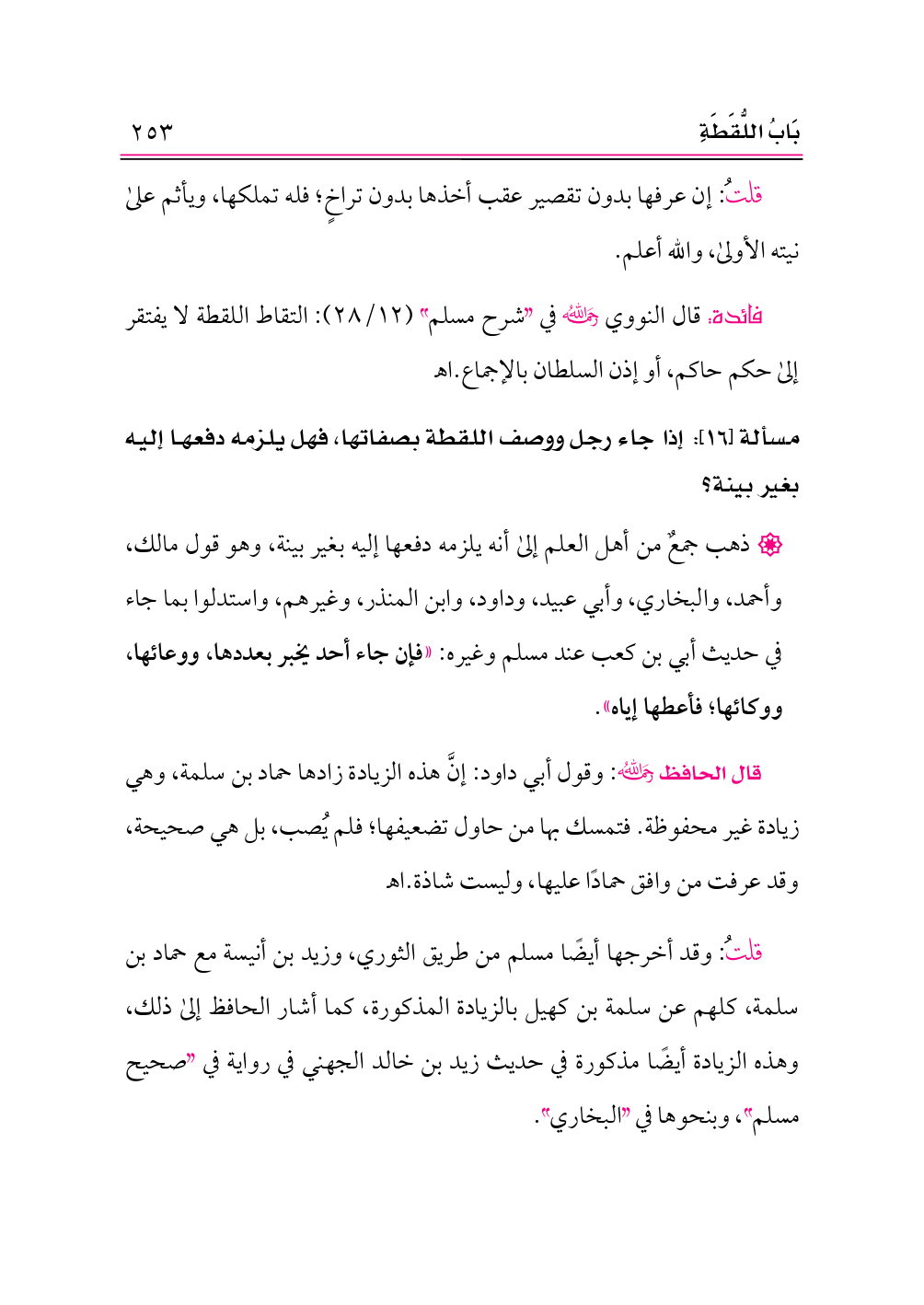 قلتُ: وقد أخرجها أيضًا مسلم من طريق الثوري، وزيد بن أنيسة مع حماد بن سلمة، كلهم عن سلمة بن كهيل بالزيادة المذكورة، كما أشار الحافظ إلى ذلك، وهذه الزيادة أيضًا مذكورة في حديث زيد بن خالد الجهني في رواية في «صحيح مسلم»، وبنحوها في «البخاري».