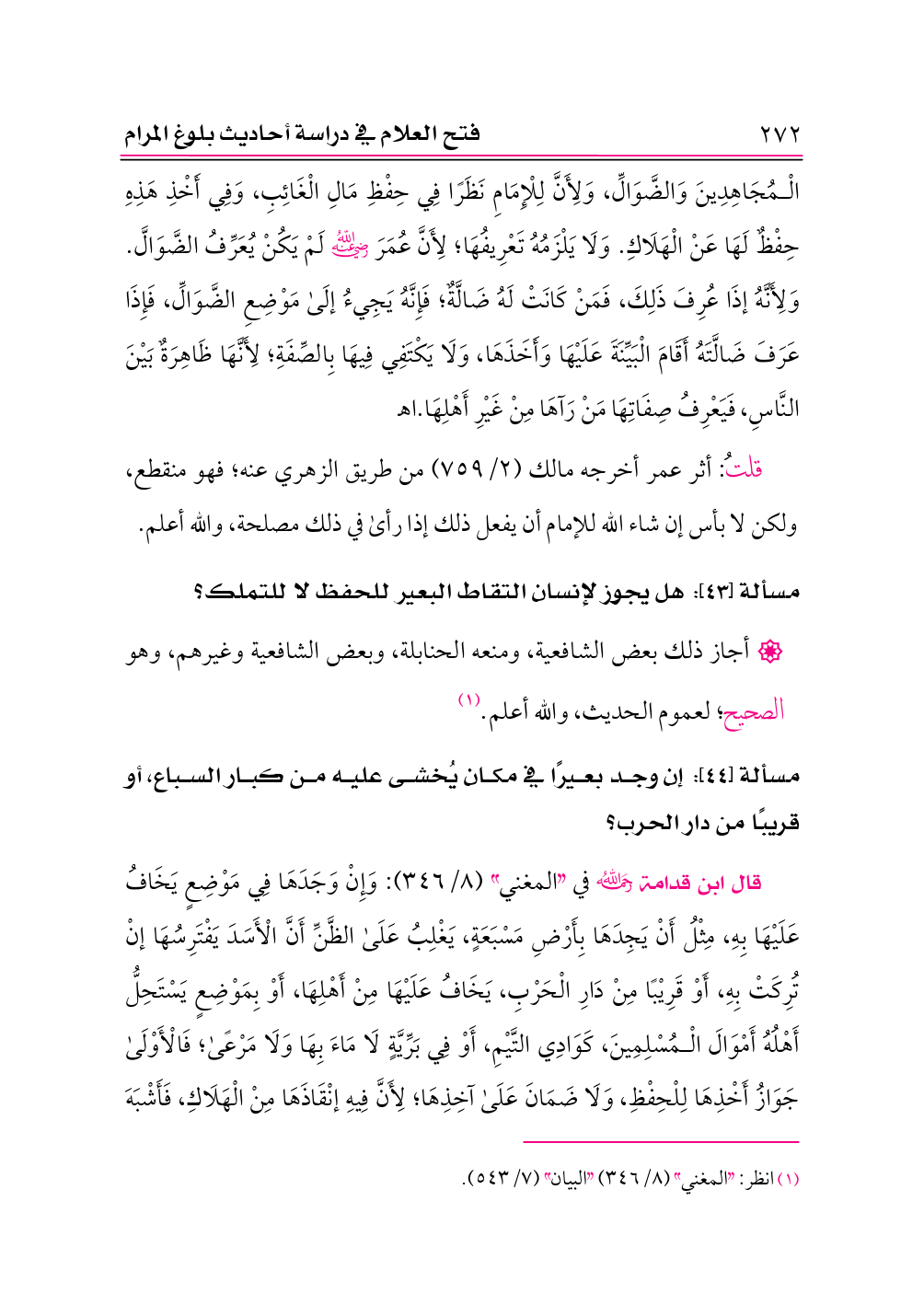 الْمُجَاهِدِينَ وَالضَّوَالِّ، وَلِأَنَّ لِلْإِمَامِ نَظَرًا فِي حِفْظِ مَالِ الْغَائِبِ، وَفِي أَخْذِ هَذِهِ حِفْظٌ لَهَا عَنْ الْهَلَاكِ. وَلَا يَلْزَمُهُ تَعْرِيفُهَا؛ لِأَنَّ عُمَرَ -رضي الله عنه- لَمْ يَكُنْ يُعَرِّفُ الضَّوَالَّ. وَلِأَنَّهُ إذَا عُرِفَ ذَلِكَ، فَمَنْ كَانَتْ لَهُ ضَالَّةٌ؛ فَإِنَّهُ يَجِيءُ إلَى مَوْضِعِ الضَّوَالِّ، فَإِذَا عَرَفَ ضَالَّتَهُ أَقَامَ الْبَيِّنَةَ عَلَيْهَا وَأَخَذَهَا، وَلَا يَكْتَفِي فِيهَا بِالصِّفَةِ؛ لِأَنَّهَا ظَاهِرَةٌ بَيْنَ النَّاسِ، فَيَعْرِفُ صِفَاتِهَا مَنْ رَآهَا مِنْ غَيْرِ أَهْلِهَا. اهـ