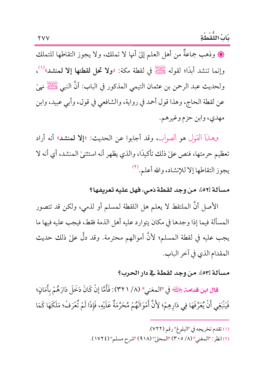 وهذا القول هو الصواب، وقد أجابوا عن الحديث: «إلا لمنشد» أنه أراد تعظيم حرمتها، فنص على ذلك تأكيدًا، والذي يظهر أنه استثنى المنشد، أي أنه لا يجوز التقاطها إلا للإنشاد، والله أعلم. (¬٢)