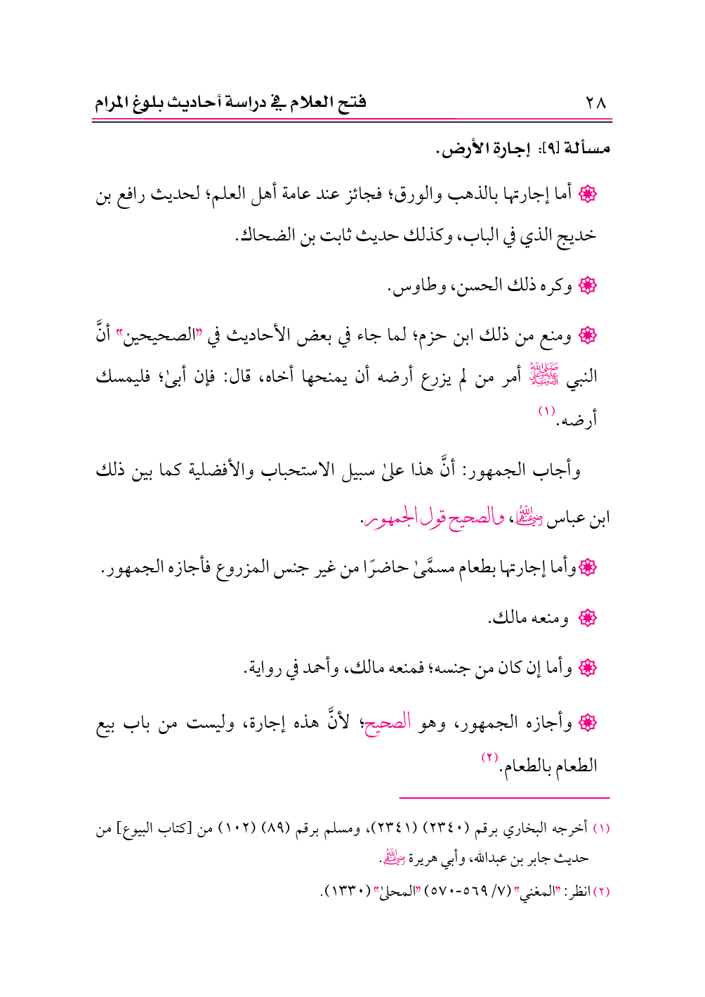• ومنع من ذلك ابن حزم؛ لما جاء في بعض الأحاديث في «الصحيحين» أنَّ النبي -صلى الله عليه وعلى آله وسلم- أمر من لم يزرع أرضه أن يمنحها أخاه، قال: فإن أبى؛ فليمسك أرضه. (¬١)