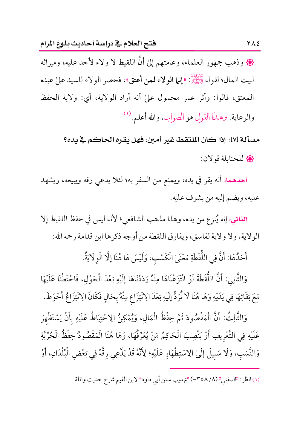 • وذهب جمهور العلماء، وعامتهم إلى أنَّ اللقيط لا ولاء لأحد عليه، وميراثه لبيت المال؛ لقوله -صلى الله عليه وعلى آله وسلم-: «إنما الولاء لمن أعتق»، فحصر الولاء للسيد على عبده المعتق، قالوا: وأثر عمر محمول على أنه أراد الولاية، أي: ولاية الحفظ والرعاية. وهذا القول هو الصواب، والله أعلم. (¬١)