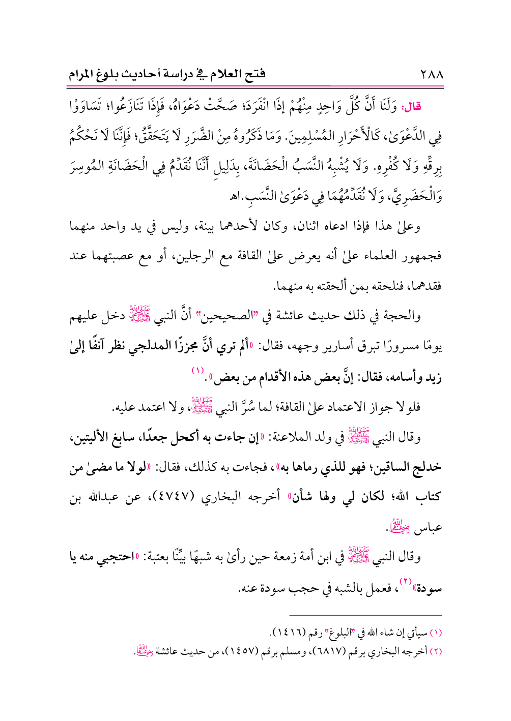 والحجة في ذلك حديث عائشة في «الصحيحين» أنَّ النبي -صلى الله عليه وعلى آله وسلم- دخل عليهم يومًا مسرورًا تبرق أسارير وجهه، فقال: «ألم تري أنَّ مجززًا المدلجي نظر آنفًا إلى زيد وأسامه، فقال: إنَّ بعض هذه الأقدام من بعض». (¬١)