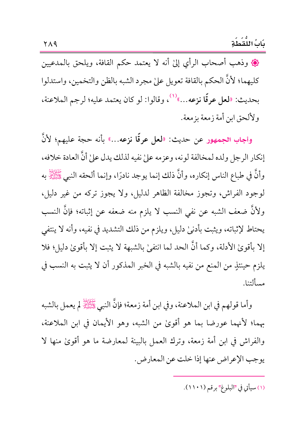 وأجاب الجمهور عن حديث: «لعل عرقًا نزعه ... » بأنه حجة عليهم؛ لأنَّ إنكار الرجل ولده لمخالفة لونه، وعزمه على نفيه لذلك يدل على أنَّ العادة خلافه، وأنَّ في طباع الناس إنكاره، وأنَّ ذلك إنما يوجد نادرًا، وإنما ألحقه النبي -صلى الله عليه وعلى آله وسلم- به لوجود الفراش، وتجوز مخالفة الظاهر لدليل، ولا يجوز تركه من غير دليل، ولأنَّ ضعف الشبه عن نفي النسب لا يلزم منه ضعفه عن إثباته؛ فإنَّ النسب يحتاط لإثباته، ويثبت بأدنى دليل، ويلزم من ذلك التشديد في نفيه، وأنه لا ينتفي إلا بأقوى الأدلة، وكما أنَّ الحد لما انتفى بالشبهة لا يثبت إلا بأقوى دليل؛ فلا يلزم حينئذٍ من المنع من نفيه بالشبه في الخبر المذكور أن لا يثبت به النسب في مسألتنا.