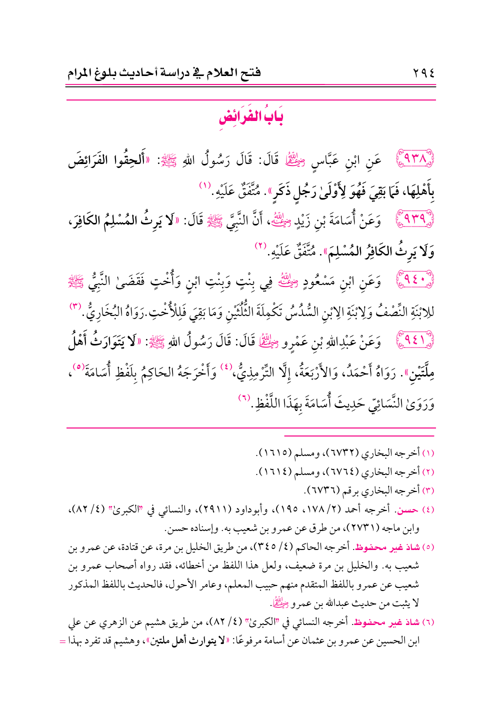 ٩٣٨ - عَنِ ابْنِ عَبَّاسٍ -رضي الله عنهما- قَالَ: قَالَ رَسُولُ اللهِ - صلى الله عليه وسلم -: «أَلحِقُوا الفَرَائِضَ بِأَهْلِهَا، فَمَا بَقِيَ فَهُوَ لِأَوْلَى رَجُلٍ ذَكَرٍ». مُتَّفَقٌ عَلَيْهِ. (¬١)