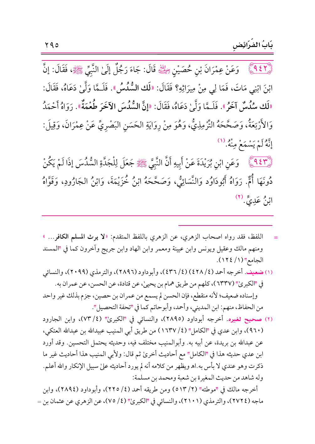 ٩٤٣ - وَعَنِ ابْنِ بُرَيْدَةَ عَنْ أَبِيهِ أَنَّ النَّبِيَّ - صلى الله عليه وسلم - جَعَلَ لِلْجَدَّةِ السُّدُسَ إذَا لَمْ يَكُنْ دُونَهَا أُمٌّ. رَوَاهُ أَبُودَاوُد وَالنَّسَائِيُّ، وَصَحَّحَهُ ابْنُ خُزَيْمَةَ، وَابْنُ الجَارُودِ، وَقَوَّاهُ ابْنُ عَدِيٍّ. (¬٢)