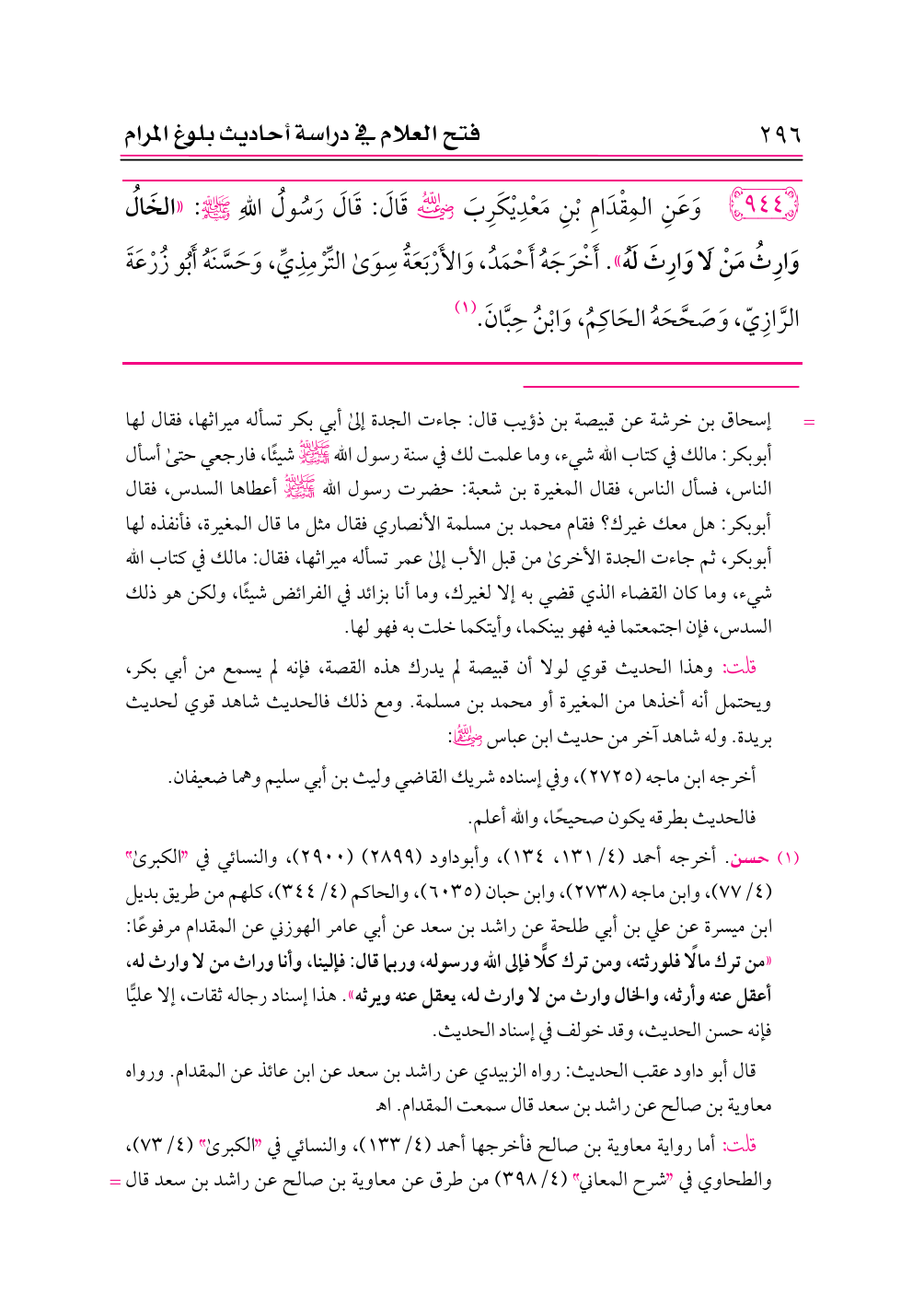 ٩٤٤ - وَعَنِ المِقْدَامِ بْنِ مَعْدِيْكَرِبَ -رضي الله عنه- قَالَ: قَالَ رَسُولُ اللهِ - صلى الله عليه وسلم -: «الخَالُ وَارِثُ مَنْ لَا وَارِثَ لَهُ». أَخْرَجَهُ أَحْمَدُ، وَالأَرْبَعَةُ سِوَى التِّرْمِذِيِّ، وَحَسَّنَهُ أَبُو زُرْعَةَ الرَّازِيّ، وَصَحَّحَهُ الحَاكِمُ، وَابْنُ حِبَّانَ. (¬١)