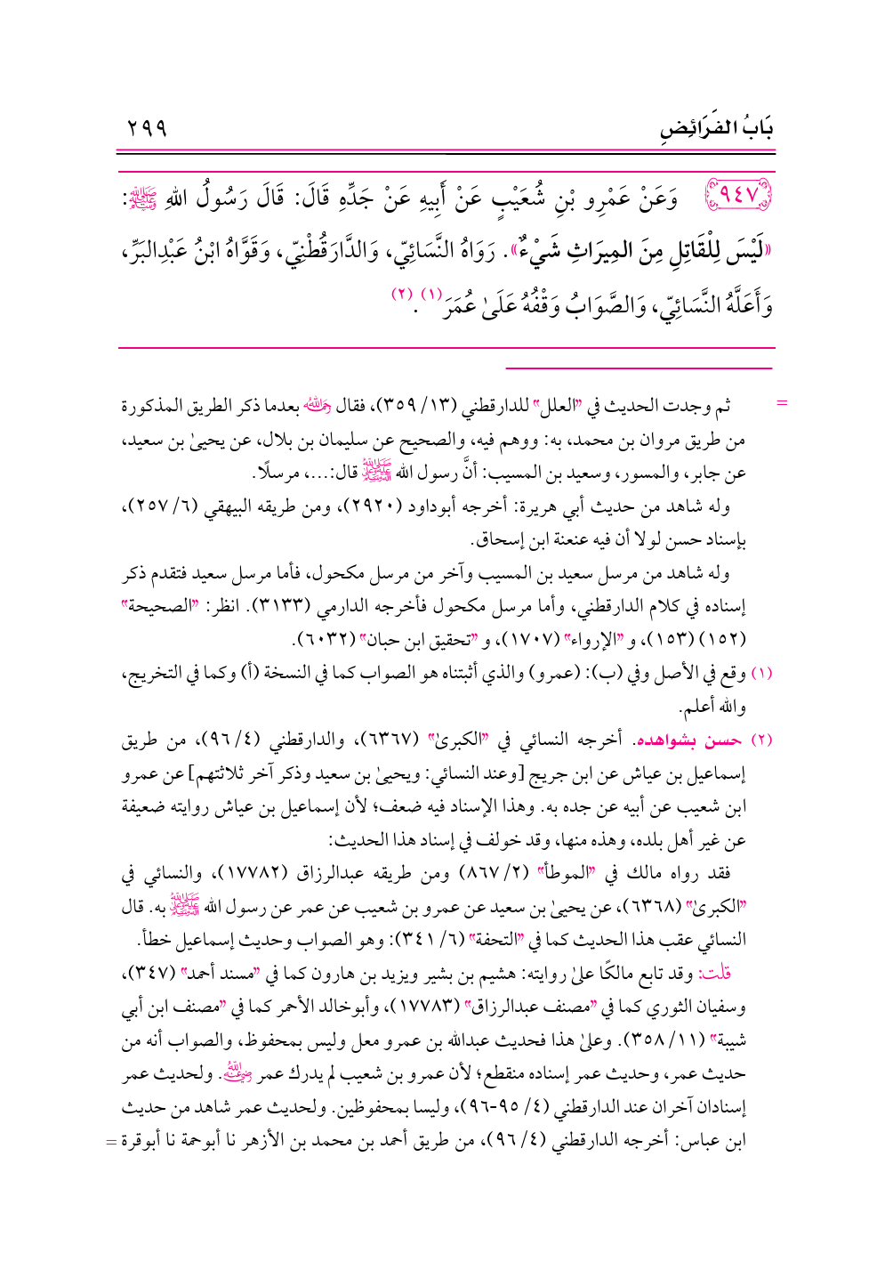 ٩٤٧ - وَعَنْ عَمْرِو بْنِ شُعَيْبٍ عَنْ أَبِيهِ عَنْ جَدِّهِ قَالَ: قَالَ رَسُولُ اللهِ - صلى الله عليه وسلم -: «لَيْسَ لِلْقَاتِلِ مِنَ المِيرَاثِ شَيْءٌ». رَوَاهُ النَّسَائِيّ، وَالدَّارَقُطْنِيّ، وَقَوَّاهُ ابْنُ عَبْدِالبَرِّ، وَأَعَلَّهُ النَّسَائِيّ، وَالصَّوَابُ وَقْفُهُ عَلَى عُمَرَ (¬١). (¬٢)