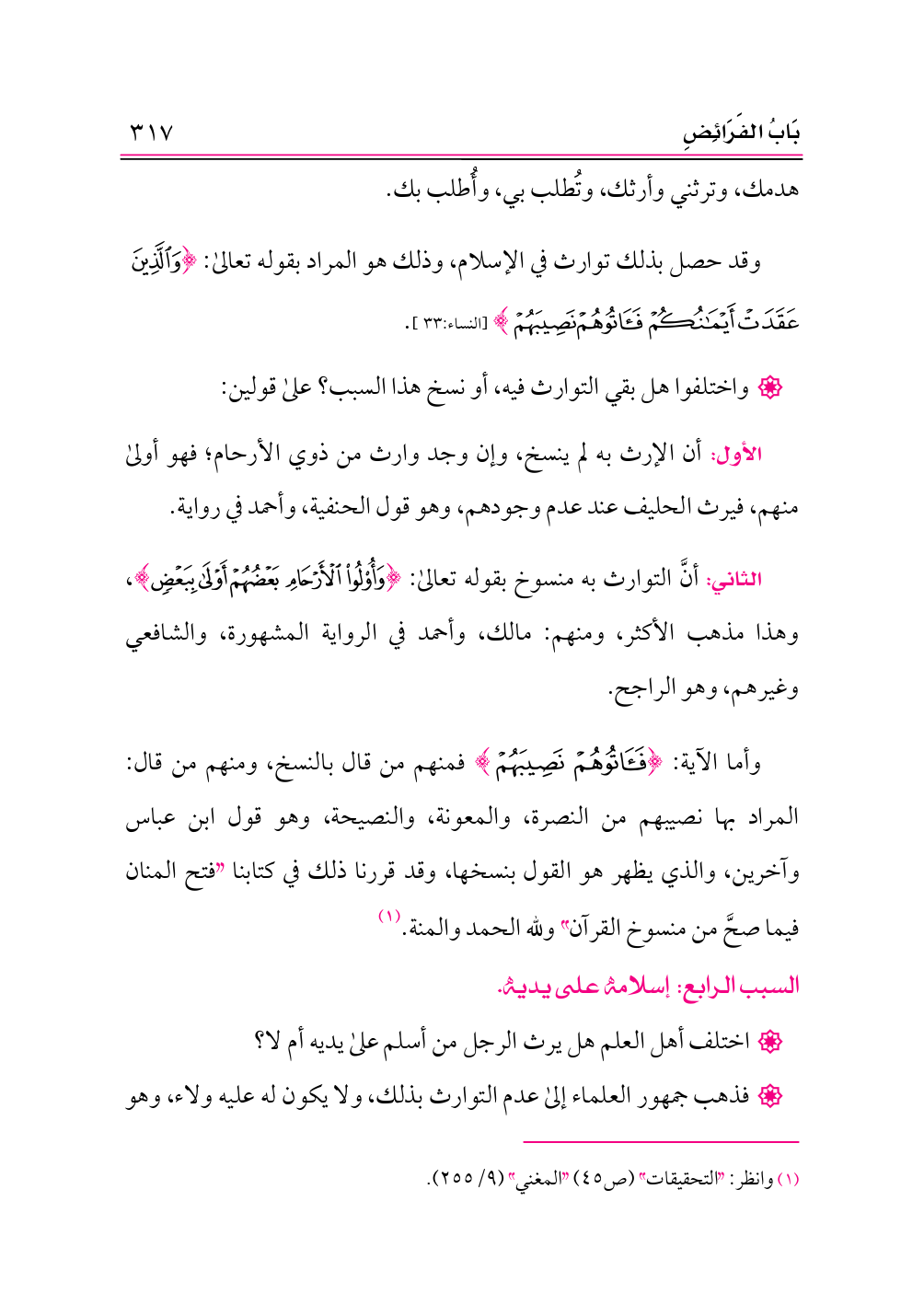 وأما الآية: {فَآتُوهُمْ نَصِيبَهُمْ} فمنهم من قال بالنسخ، ومنهم من قال: المراد بها نصيبهم من النصرة، والمعونة، والنصيحة، وهو قول ابن عباس وآخرين، والذي يظهر هو القول بنسخها، وقد قررنا ذلك في كتابنا «فتح المنان فيما صحَّ من منسوخ القرآن» ولله الحمد والمنة. (¬١)