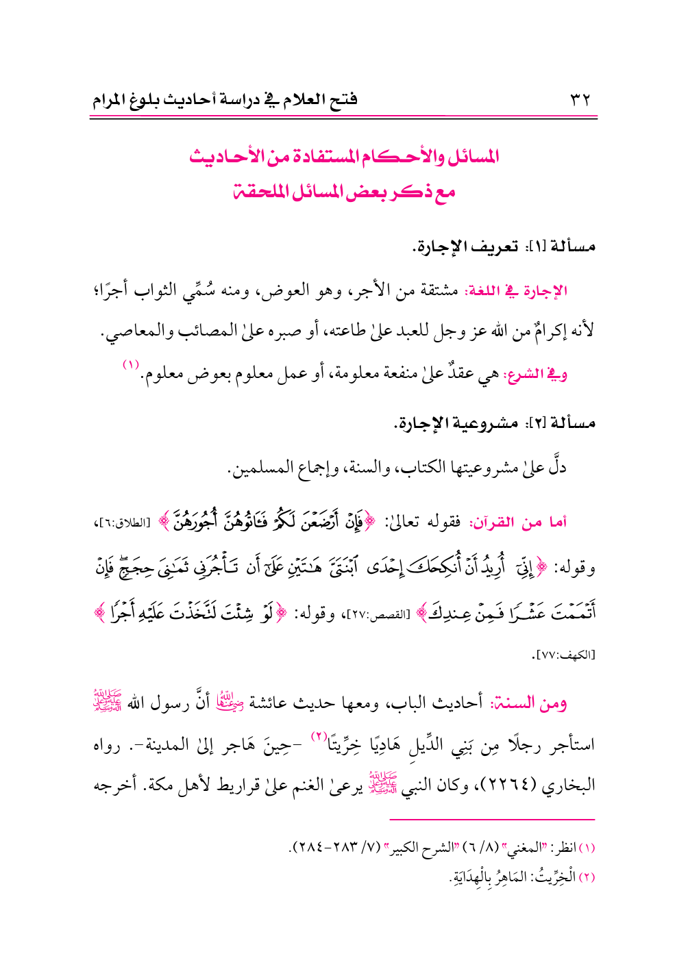 ومن السنة: أحاديث الباب، ومعها حديث عائشة -رضي الله عنها- أنَّ رسول الله -صلى الله عليه وعلى آله وسلم- استأجر رجلًا مِن بَنِي الدِّيلِ هَادِيًا خِرِّيتًا (¬٢) -حِينَ هَاجر إلى المدينة-. رواه البخاري (٢٢٦٤)، وكان النبي -صلى الله عليه وعلى آله وسلم- يرعى الغنم على قراريط لأهل مكة. أخرجه البخاري