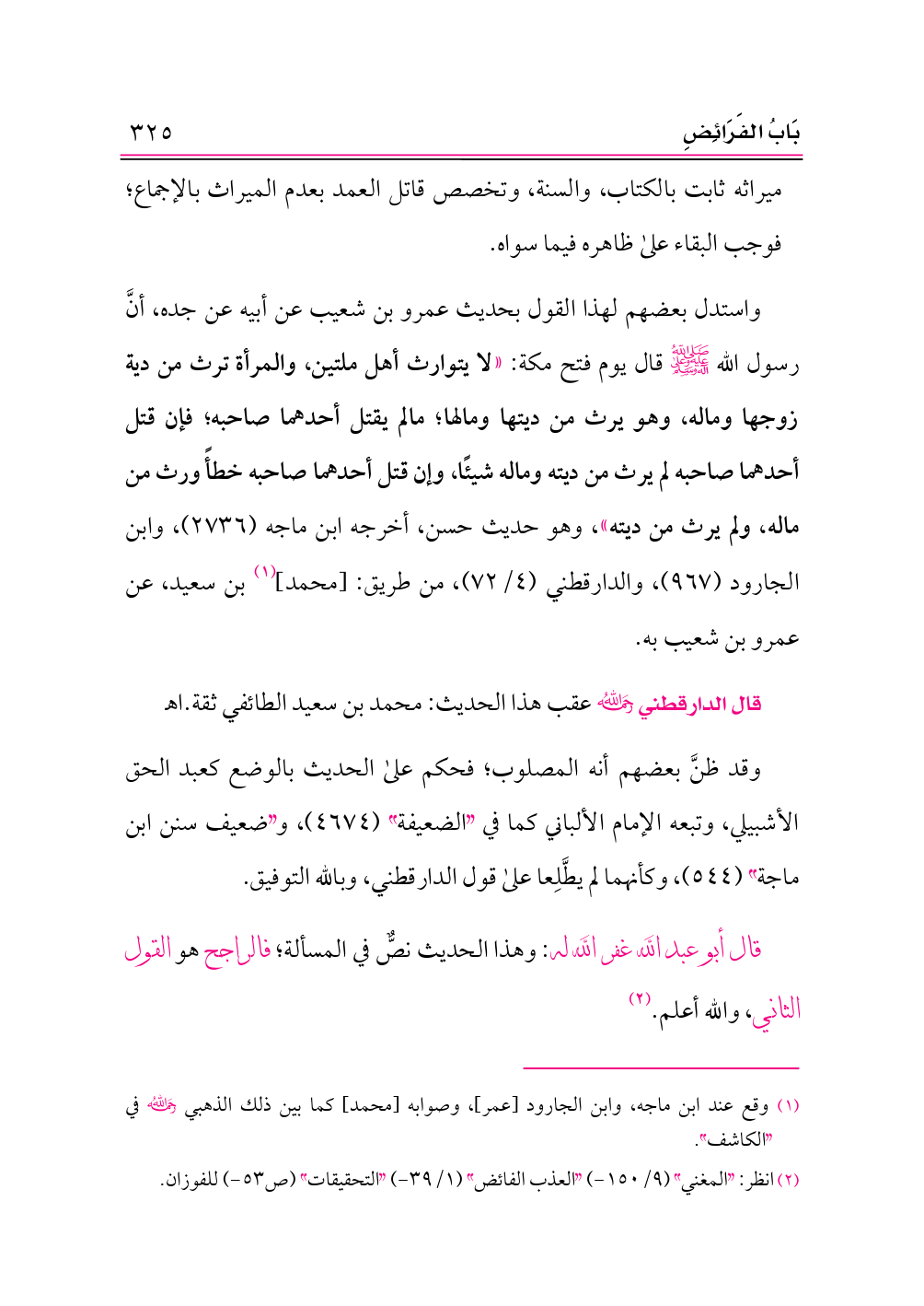 واستدل بعضهم لهذا القول بحديث عمرو بن شعيب عن أبيه عن جده، أنَّ رسول الله -صلى الله عليه وعلى آله وسلم- قال يوم فتح مكة: «لا يتوارث أهل ملتين، والمرأة ترث من دية زوجها وماله، وهو يرث من ديتها ومالها؛ مالم يقتل أحدهما صاحبه؛ فإن قتل أحدهما صاحبه لم يرث من ديته وماله شيئًا، وإن قتل أحدهما صاحبه خطأً ورث من ماله، ولم يرث من ديته»، وهو حديث حسن، أخرجه ابن ماجه (٢٧٣٦)، وابن الجارود (٩٦٧)، والدارقطني (٤/ ٧٢)، من طريق: [محمد] (¬١) بن سعيد، عن عمرو بن شعيب به.