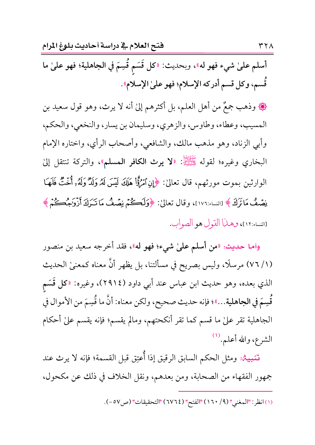 وأما حديث: «من أسلم على شيء؛ فهو له»، فقد أخرجه سعيد بن منصور (١/ ٧٦) مرسلًا، وليس بصريح في مسألتنا، بل يظهر أنَّ معناه كمعنى الحديث الذي بعده، وهو حديث ابن عباس عند أبي داود (٢٩١٤)، وغيره: «كل قَسَمٍ قُسِمَ في الجاهلية ... »؛ فإنه حديث صحيح، ولكن معناه: أنَّ ما قُسِمَ من الأموال في الجاهلية تقر على ما قسم كما تقر أنكحتهم، ومالم يقسم؛ فإنه يقسم على أحكام الشرع، والله أعلم. (¬١)