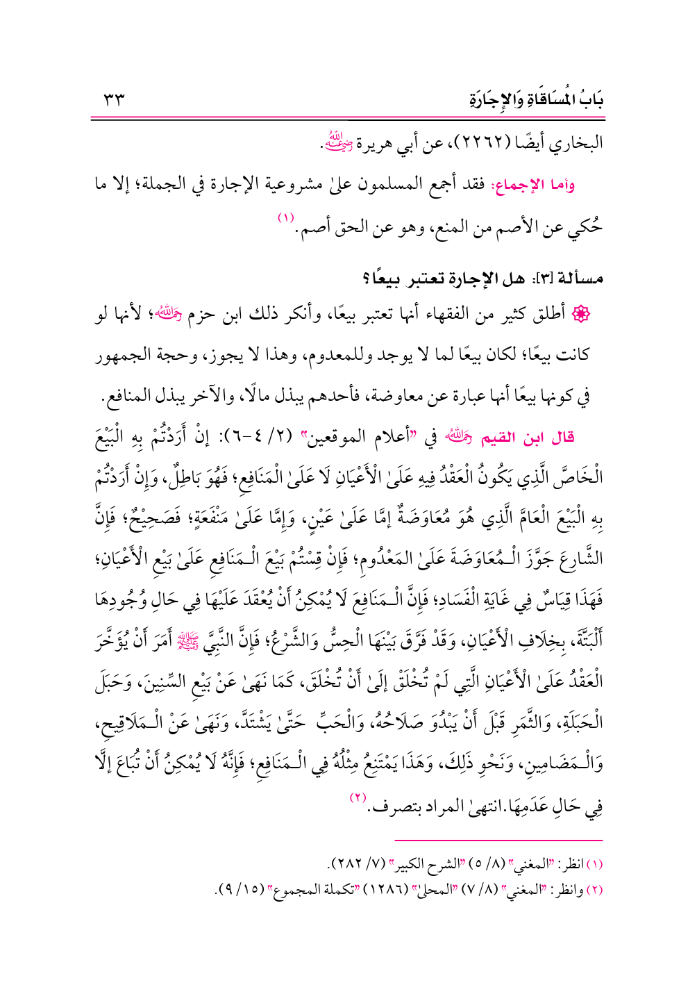 قال ابن القيم -رحمه الله- في «أعلام الموقعين» (٢/ ٤ - ٦): إنْ أَرَدْتُمْ بِهِ الْبَيْعَ الْخَاصَّ الَّذِي يَكُونُ الْعَقْدُ فِيهِ عَلَى الْأَعْيَانِ لَا عَلَى الْمَنَافِعِ؛ فَهُوَ بَاطِلٌ، وَإِنْ أَرَدْتُمْ بِهِ الْبَيْعَ الْعَامَّ الَّذِي هُوَ مُعَاوَضَةٌ إمَّا عَلَى عَيْنٍ، وَإِمَّا عَلَى مَنْفَعَةٍ؛ فَصَحِيْحٌ؛ فَإِنَّ الشَّارِعَ جَوَّزَ الْمُعَاوَضَةَ عَلَى المَعْدُومِ؛ فَإِنْ قِسْتُمْ بَيْعَ الْمَنَافِعِ عَلَى بَيْعِ الْأَعْيَانِ؛ فَهَذَا قِيَاسٌ فِي غَايَةِ الْفَسَادِ؛ فَإِنَّ الْمَنَافِعَ لَا يُمْكِنُ أَنْ يُعْقَدَ عَلَيْهَا فِي حَالِ وُجُودِهَا أَلْبَتَّةَ، بِخِلَافِ الْأَعْيَانِ، وَقَدْ فَرَّقَ بَيْنَهَا الْحِسُّ وَالشَّرْعُ؛ فَإِنَّ النَّبِيَّ - صلى الله عليه وسلم - أَمَرَ أَنْ يُؤَخَّرَ الْعَقْدُ عَلَى الْأَعْيَانِ الَّتِي لَمْ تُخْلَقْ إلَى أَنْ تُخْلَقَ، كَمَا نَهَى عَنْ بَيْعِ السِّنِينَ، وَحَبَلَ الْحَبَلَةِ، وَالثَّمَرِ قَبْلَ أَنْ يَبْدُوَ صَلَاحُهُ، وَالْحَبِّ حَتَّى يَشْتَدَّ، وَنَهَى عَنْ الْمَلَاقِيحِ، وَالْمَضَامِينِ، وَنَحْوِ ذَلِكَ، وَهَذَا يَمْتَنِعُ مِثْلُهُ فِي الْمَنَافِعِ؛ فَإِنَّهُ لَا يُمْكِنُ أَنْ تُبَاعَ إلَّا فِي حَالِ عَدَمِهَا. انتهى المراد بتصرف. (¬٢)