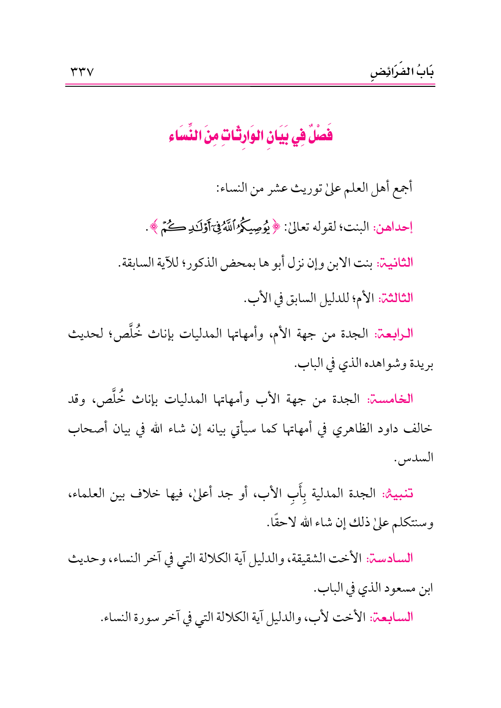فَصْلٌ فِي بَيَانِ الوَارِثَاتِ مِنَ النِّسَاء