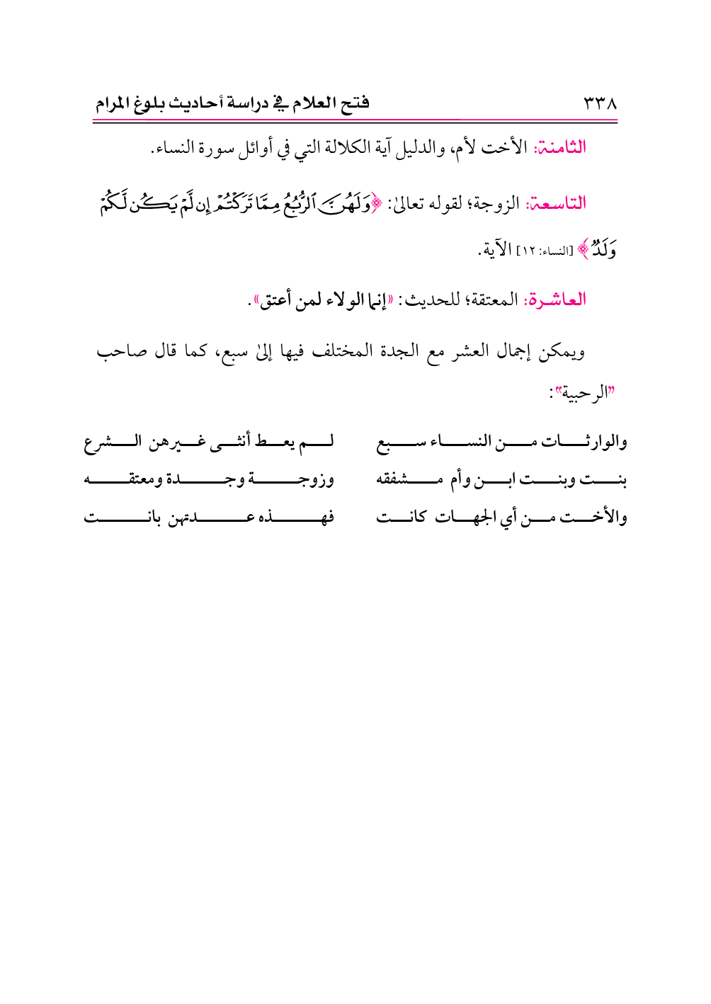 التاسعة: الزوجة؛ لقوله تعالى: {وَلَهُنَّ الرُّبُعُ مِمَّا تَرَكْتُمْ إِنْ لَمْ يَكُنْ لَكُمْ وَلَدٌ} [النساء: ١٢] الآية.