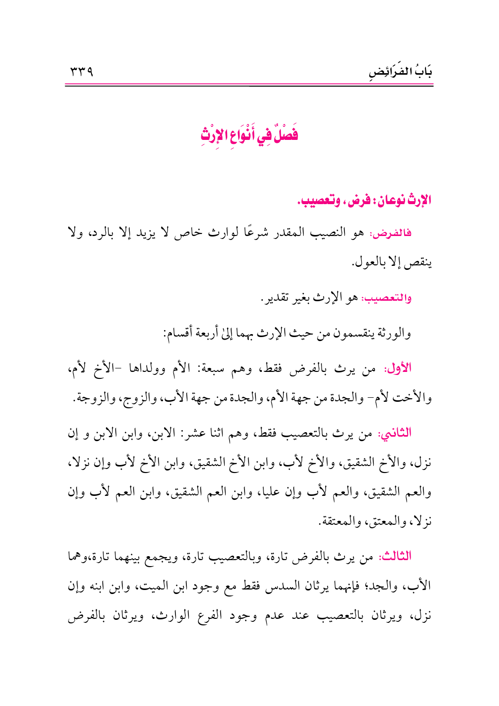الإرث نوعان: فرض، وتعصيب.