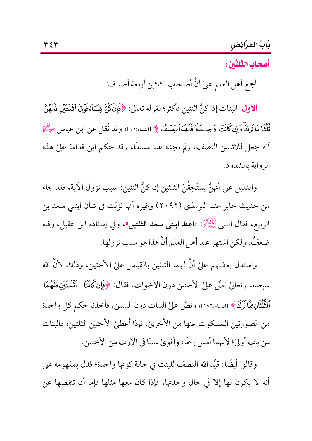 الأول: البنات إذا كنَّ اثنتين فأكثر؛ لقوله تعالى: {فَإِنْ كُنَّ نِسَاءً فَوْقَ اثْنَتَيْنِ فَلَهُنَّ ثُلُثَا مَا تَرَكَ وَإِنْ كَانَتْ وَاحِدَةً فَلَهَا النِّصْفُ} [النساء:١١]، وقد نُقل عن ابن عباس -رضي الله عنهما- أنه جعل للاثنتين النصف، ولم نجده عنه مسندًا، وقد حكم ابن قدامة على هذه الرواية بالشذوذ.