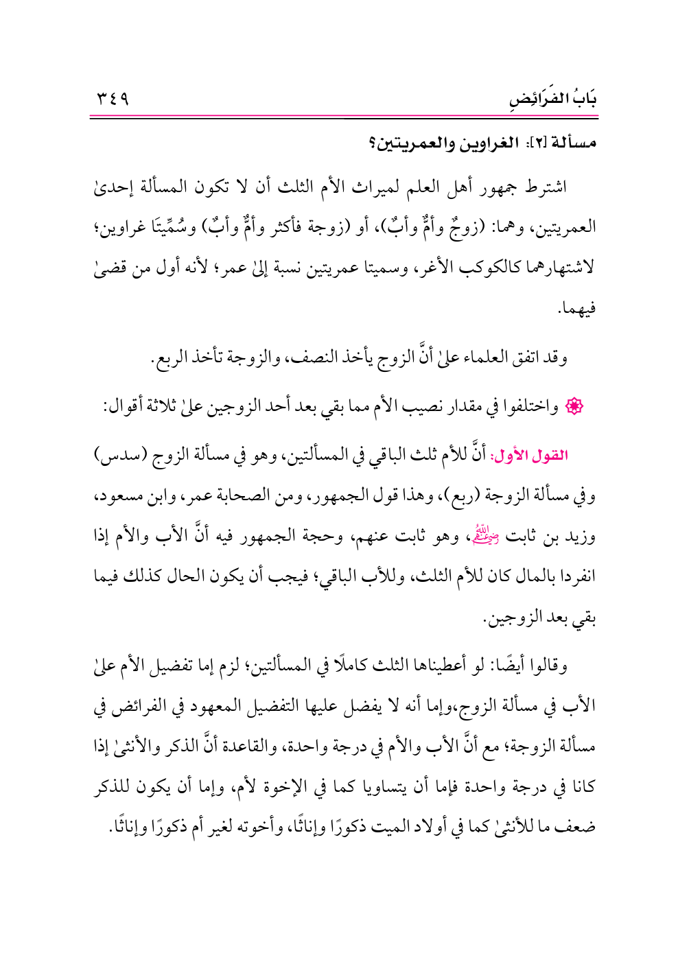 وقالوا أيضًا: لو أعطيناها الثلث كاملًا في المسألتين؛ لزم إما تفضيل الأم على الأب في مسألة الزوج، وإما أنه لا يفضل عليها التفضيل المعهود في الفرائض في مسألة الزوجة؛ مع أنَّ الأب والأم في درجة واحدة، والقاعدة أنَّ الذكر والأنثى إذا كانا في درجة واحدة فإما أن يتساويا كما في الإخوة لأم، وإما أن يكون للذكر ضعف ما للأنثى كما في أولاد الميت ذكورًا وإناثًا، وأخوته لغير أم ذكورًا وإناثًا.