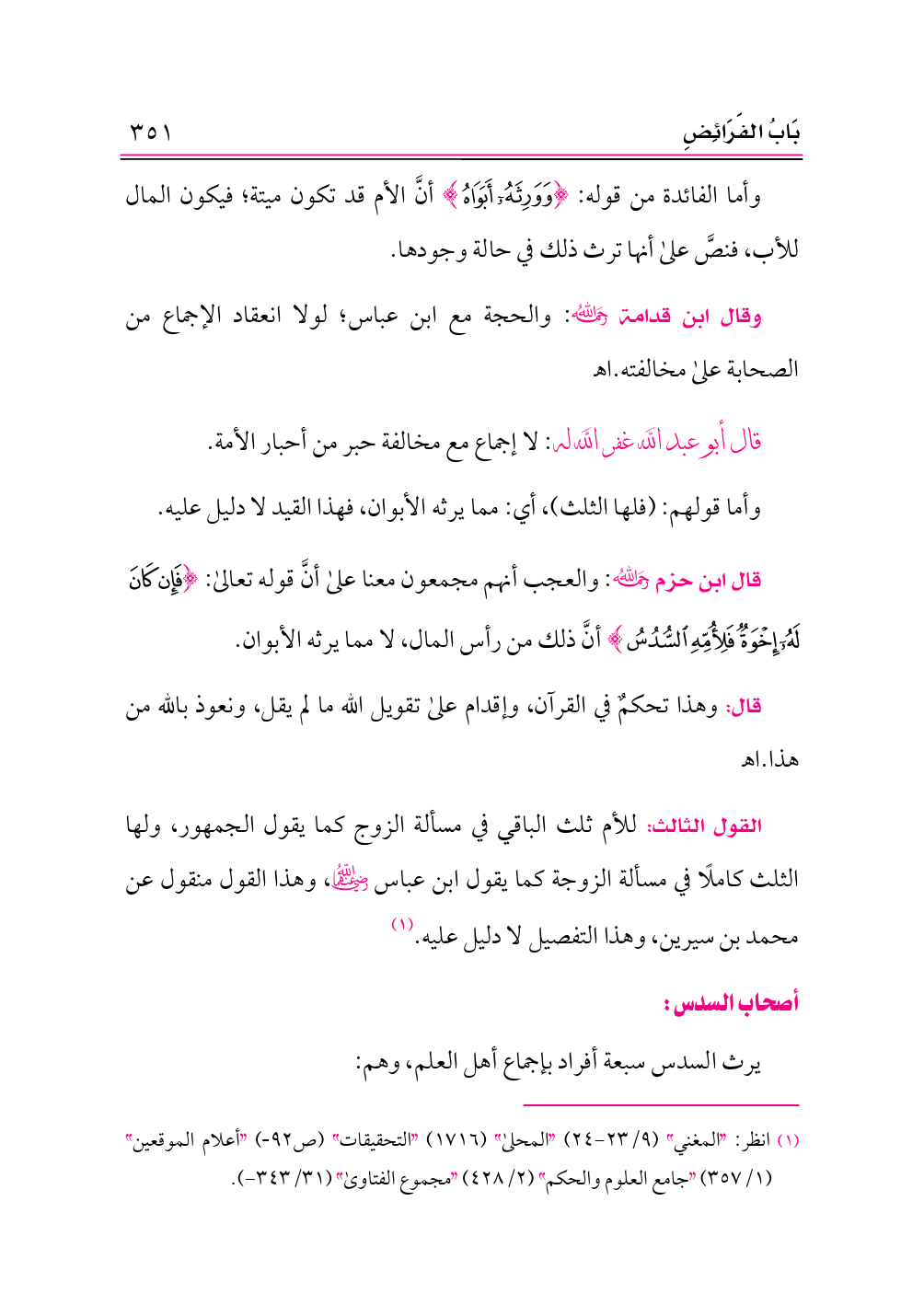 قال ابن حزم -رحمه الله-: والعجب أنهم مجمعون معنا على أنَّ قوله تعالى: {فَإِنْ كَانَ لَهُ إِخْوَةٌ فَلِأُمِّهِ السُّدُسُ} أنَّ ذلك من رأس المال، لا مما يرثه الأبوان.