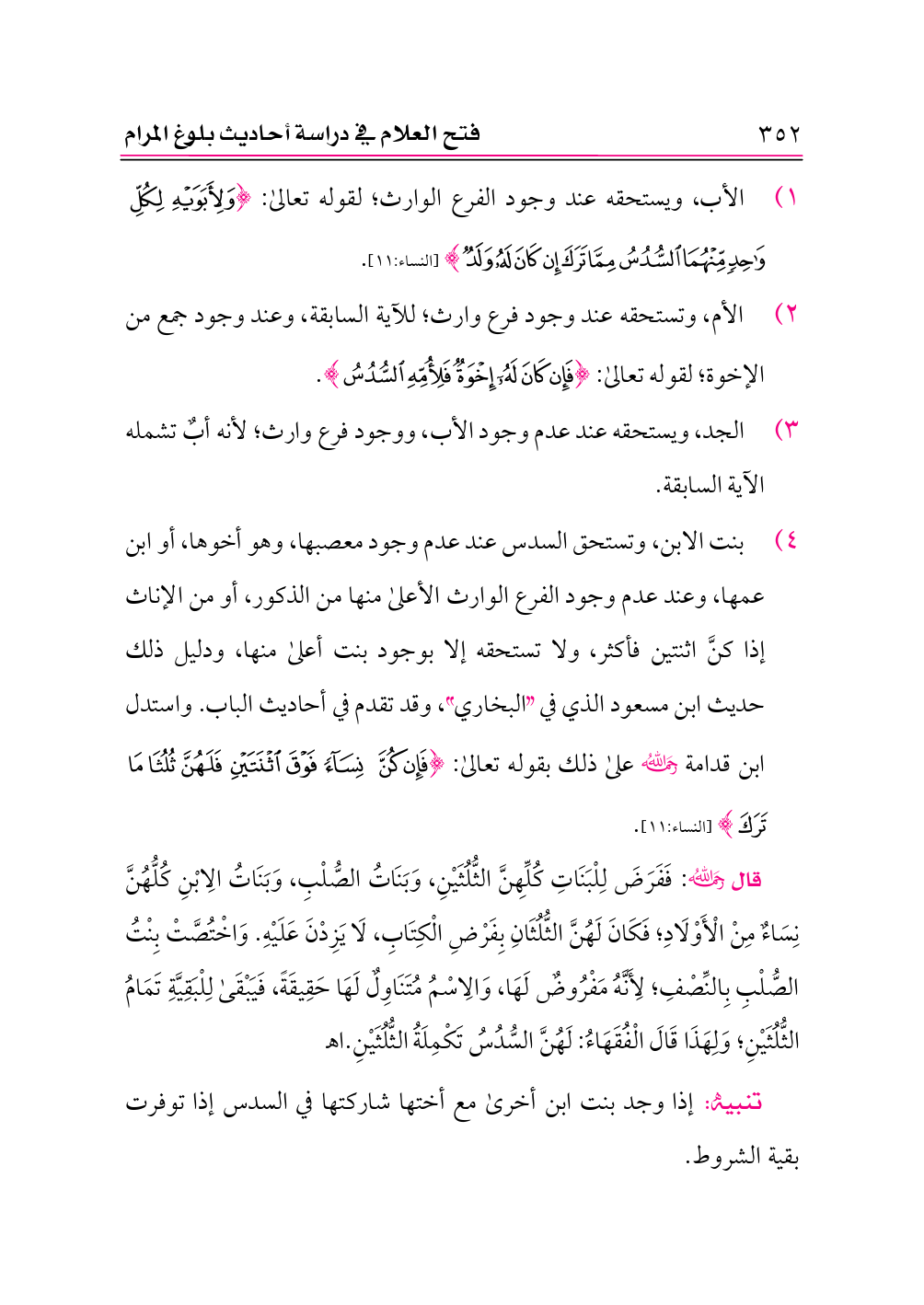 ٤) بنت الابن، وتستحق السدس عند عدم وجود معصبها، وهو أخوها، أو ابن عمها، وعند عدم وجود الفرع الوارث الأعلى منها من الذكور، أو من الإناث إذا كنَّ اثنتين فأكثر، ولا تستحقه إلا بوجود بنت أعلى منها، ودليل ذلك حديث ابن مسعود الذي في «البخاري»، وقد تقدم في أحاديث الباب. واستدل ابن قدامة -رحمه الله- على ذلك بقوله تعالى: {فَإِنْ كُنَّ نِسَاءً فَوْقَ اثْنَتَيْنِ فَلَهُنَّ ثُلُثَا مَا تَرَكَ} [النساء:١١].