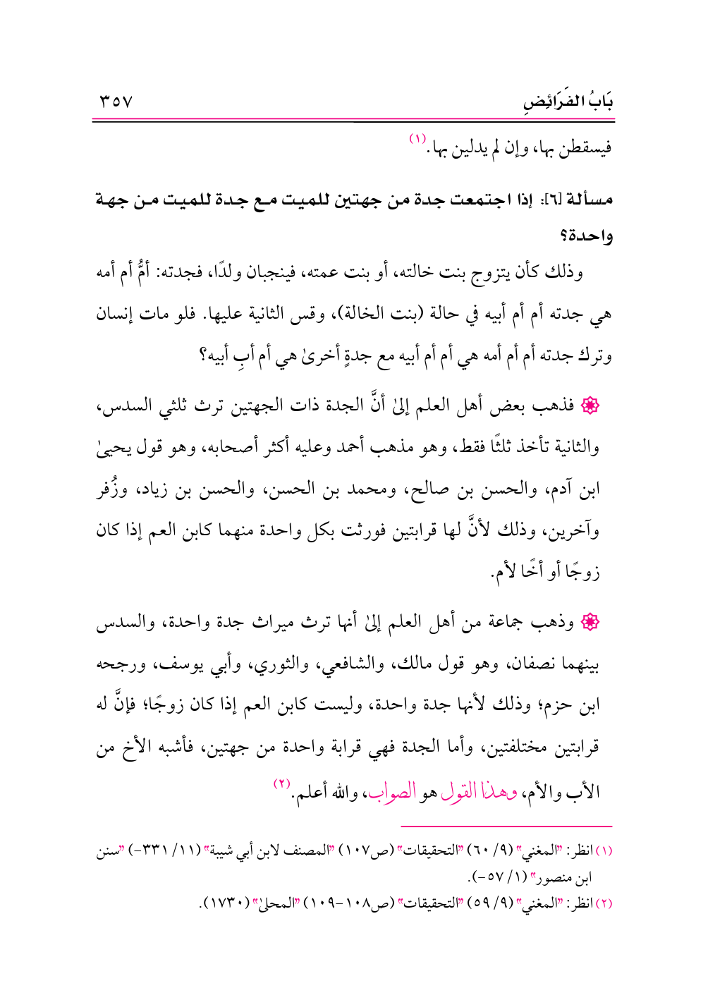 • وذهب جماعة من أهل العلم إلى أنها ترث ميراث جدة واحدة، والسدس بينهما نصفان، وهو قول مالك، والشافعي، والثوري، وأبي يوسف، ورجحه ابن حزم؛ وذلك لأنها جدة واحدة، وليست كابن العم إذا كان زوجًا؛ فإنَّ له قرابتين مختلفتين، وأما الجدة فهي قرابة واحدة من جهتين، فأشبه الأخ من الأب والأم، وهذا القول هو الصواب، والله أعلم. (¬٢)